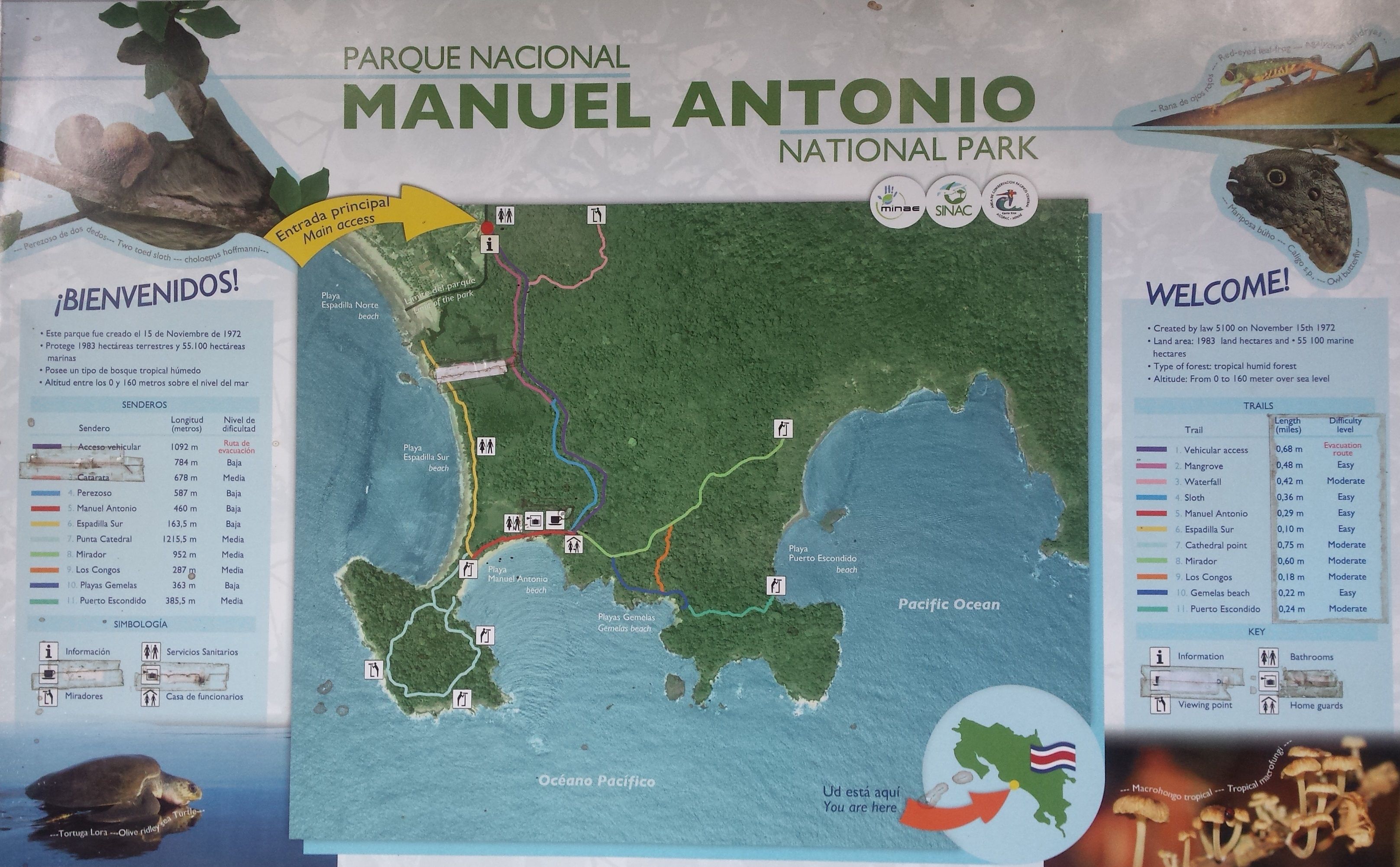 Parque Nacional Manuel Antonio, acceso 16$ (9.280 colones). Fue abierto en 1972 tras comprarlo el gobierno costarricense, presionado por los habitantes de la zona, en contra de la prohibición de sus antiguos dueños de United Fruit Company para el usufructo de las playas. A pesar de ser uno de los parques más pequeños del país, se encuentra entre los más visitados, gracias a su fácil acceso, su diversidad, y la facilidad para ver fauna. Distribuido a lo largo de la costa, lo forman varias ensenadas con playas de arena blanca y arrecifes de coral, rodeadas de selva tropical, densos bosques y manglares. Son playas paradisiacas de aguas cálidas y cristalinas, abiertas al baño la mayoría de ellas. Además posee de media docena de senderos cortos y de poca dificultad, que ofrecen unas vistas impresionantes y permiten un contacto cercano con la fauna.