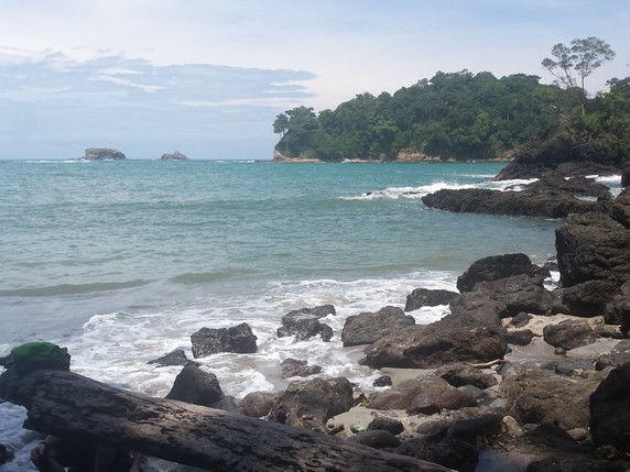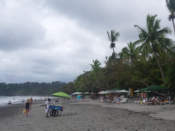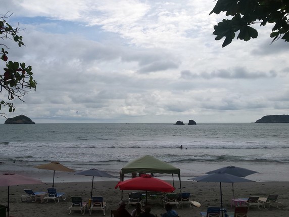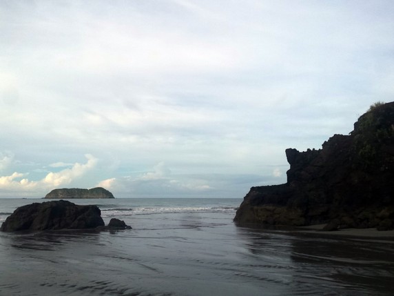 playa. Estamos en el océano Pacífico, poca broma, el mar está muy bravo y hay fuertes corrientes, pero el agua está calentita y agradable. La playa es de gravilla fina y la arena que la cubre negruzca. Para comer nos desplazamos a