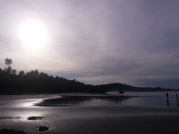A las 4h30 ya estamos despiertos, ayer nos fuimos a dormir a eso de las 20h. Desayunamos fruta y tostadas con queso en la habitación del hotel, ventajas de tener cocina con mueble bar. Coincidiendo con el amanecer salimos a pasear por la playa. La marea está baja y la playa ahora es enorme, nos cruzamos con gente que corre o pasea al perro. Hay muchas aves pescando o comiendo restos de comida de los restaurantes, y cangrejos comiendo los cocos rotos caídos de alguna palmera. Cruzamos varios riachuelos pequeños que desembocan en el mar, su agua está fría en contraste con el agua cálida del océano, aunque es mejor no bañarse si hay que seguir el consejo de los carteles que avisan de la presencia de cocodrilos.
