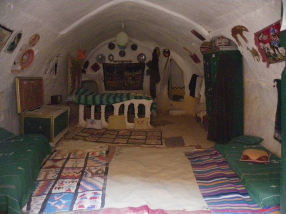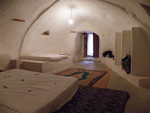 kitsch como el hotel Sidi Driss. Cuesta 25 TND por persona, cena y desayuno incluido. Las estancias son cuevas donde estar fresco en verano y caliente en invierno, el suelo esta alfombrado y caben ampliamente dos camas de matrimonio, y un enchufe. Baño compartido con agua caliente. Cena: