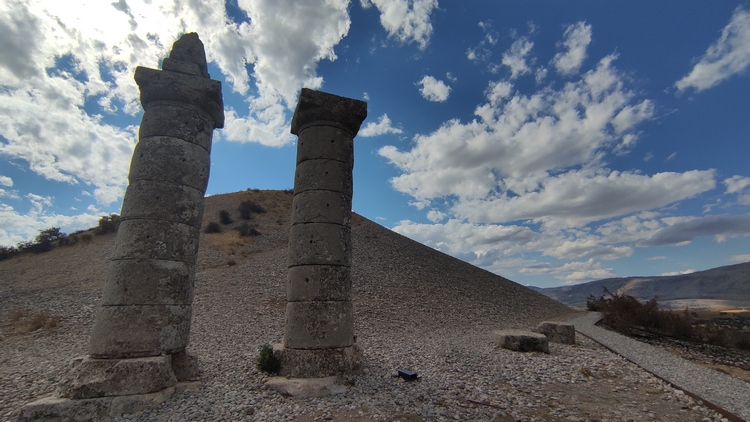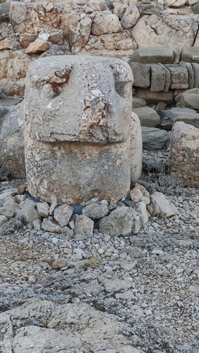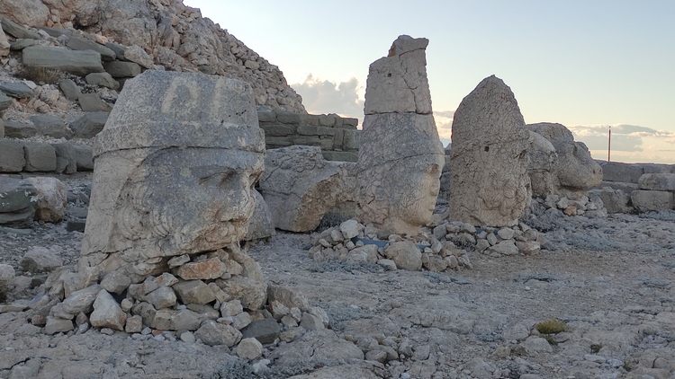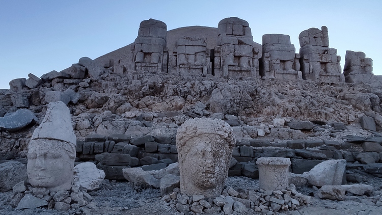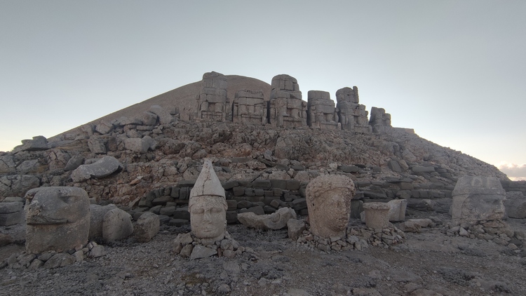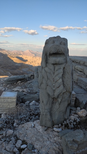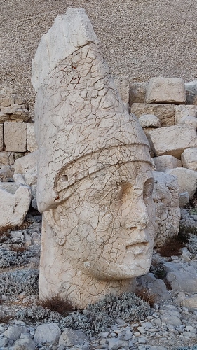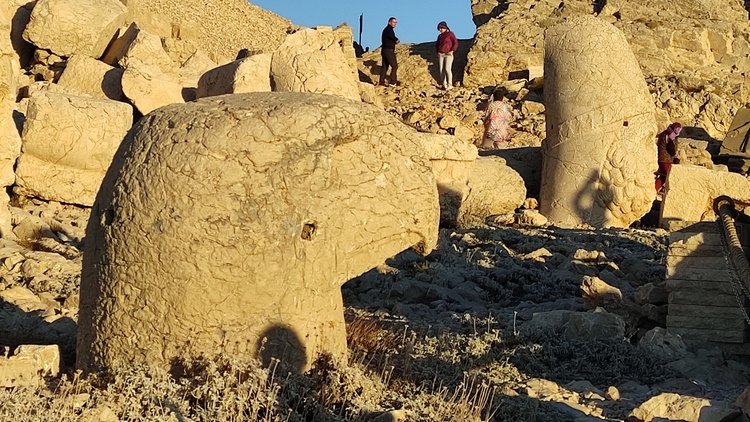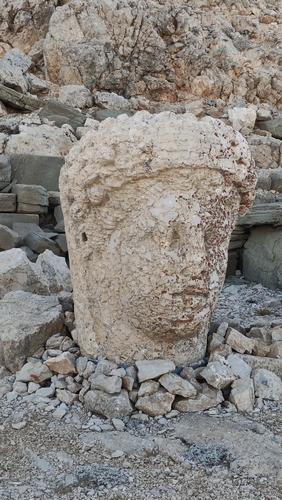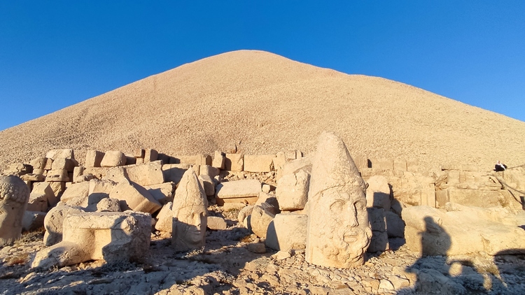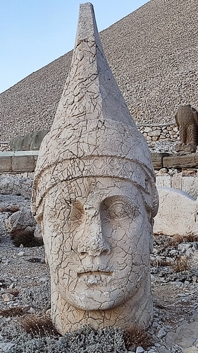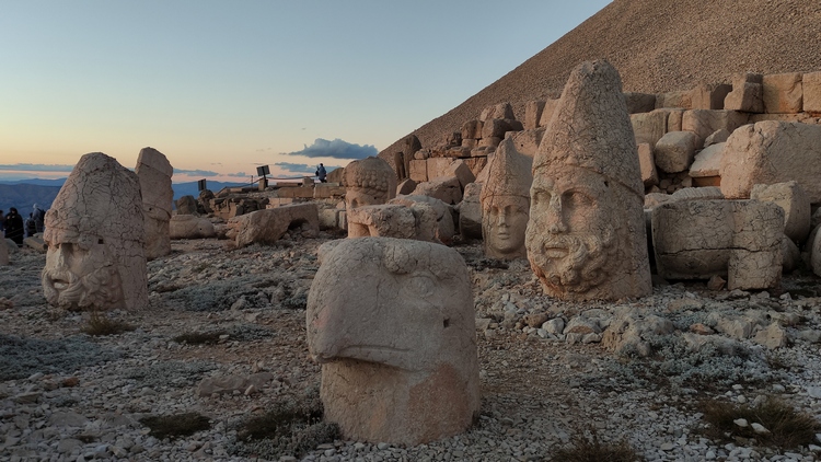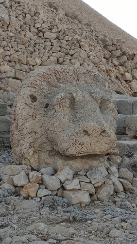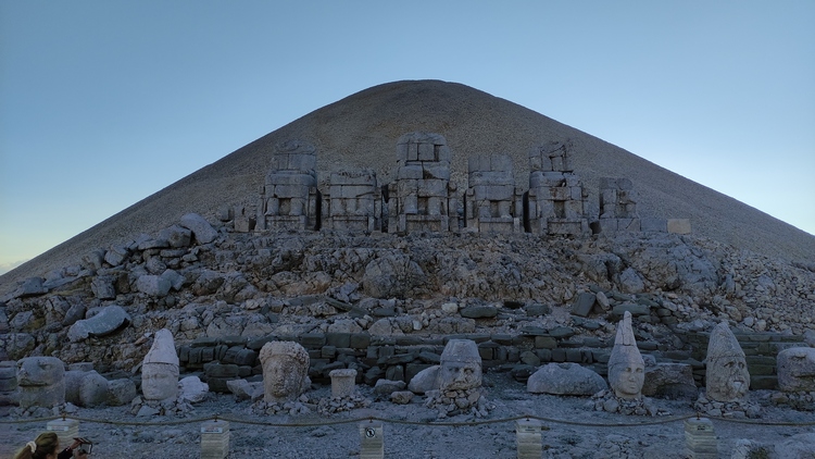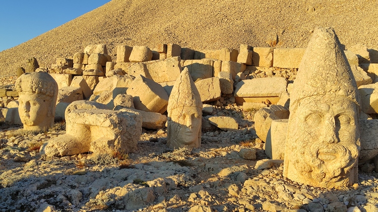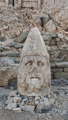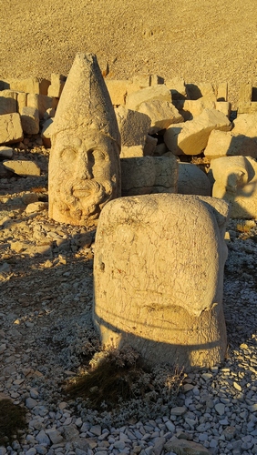Monte Nemrut es una montaña de 2.150 metros de altura, en cuya cima se encuentra un importante yacimiento arqueológico. En el año 62 aC, el rey Antioquio de Comagene, hizo construir en la cima de una montaña una enorme tumba santuario. El sepulcro se encuentra bajo un montón de piedras de 50 metros de altura y 150 de diámetro, flanqueado por dos terrazas orientadas hacia este y oeste, donde se distribuyen estatuas de 8 mts de altura y 32 toneladas de peso con representaciones de él mismo, leones, águilas y dioses mitológicos persas, griegos y armenios. Impresionante. Seguramente a causa de la actividad sísmica en la zona, las cabezas se han desprendido de los cuerpos y quedan expuestas en el suelo. La tumba nunca se ha encontrado, de hecho ni se ha buscado, dado el increíble coste técnico y económico que supondría retirar los cientos de toneladas de rocas del túmulo.
