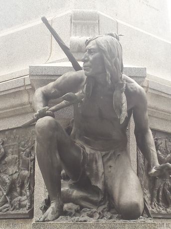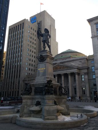 Place d'Armes, centro del Barrio Viejo, presidida por una estatua de Maisonneuve, fundador de Montreal. Lo primero que llama la atención son las dos torres de