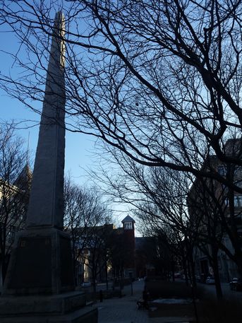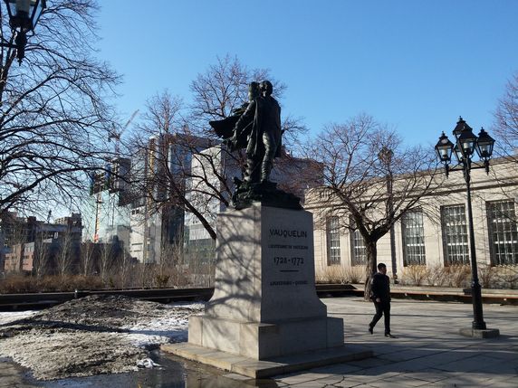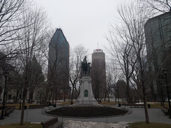 Colonne Nelson, una estatua en honor del vencedor inglés de Trafalgar sobre franceses y españoles, que descansa sobre una alta columna. Tras ella, cruzando la Rue de Notre Dame, la Place de Vauquelin, el Hotel de Ville, el Ayuntamiento de Montreal, y detras de ellos el Champ de Mars. En el lado oriental de la plaza queda el palacio de