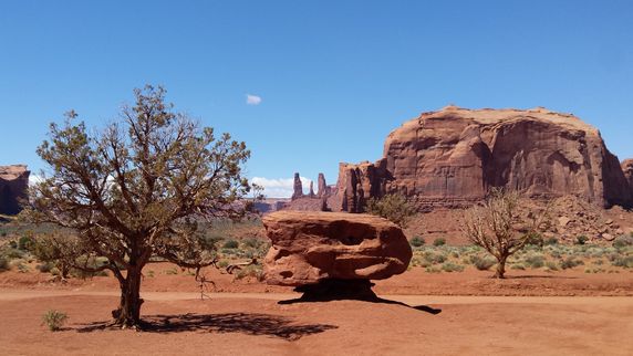 Desde Cortez seguimos la US 163, la típica carretera de un carril, cómoda, con poco tráfico, y con pocos servicios. Pequeños cañones y mesas de roca roja que parecen cortadas a cuchillo, salpican el monótono desierto de tanto en tanto. Poco antes de llegar a Monument Valley, sobre una colina a mano izquierda, vemos la Mexican Hat Rock, una curiosa roca plana de 18 mts de diámetro que a duras penas se sostiene sobre una base mucho más pequeña. Una milla más adelante está el pequeño pueblo de Mexican Hat, 80 habitantes, donde hay un par de hoteles, un camping, y una gasolinera.