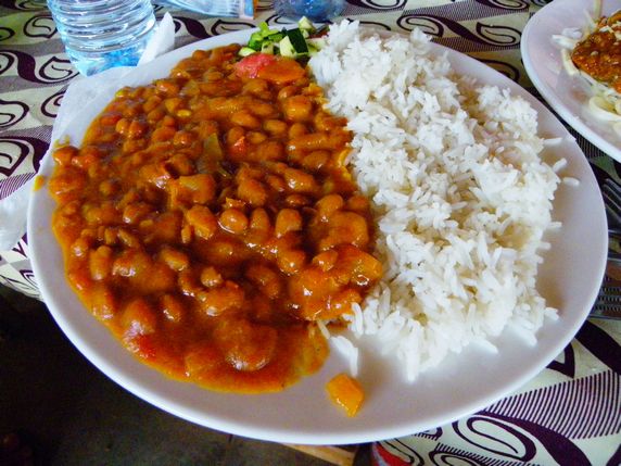 cabra con arroz y chapatti, y un plato de tilapia con arroz. 14:00