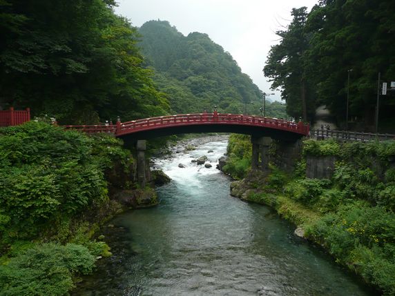 Shin-kyo. Es un puente rojo que cruza las cristalinas aguas del río Diya, supuestamente en el lugar exacto donde Shodo Shonin lo cruzo a lomos de dos serpientes gigantes hace mas de 1.200 años. El contraste entre el puente rojo y el fondo verde producen un bonito efecto.