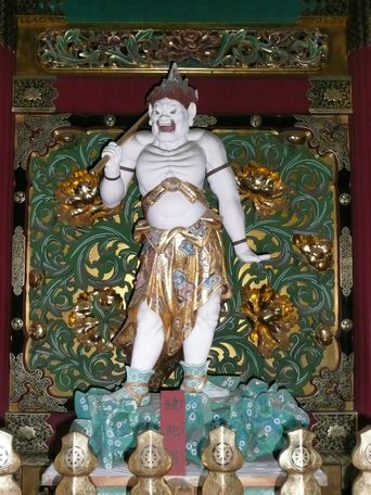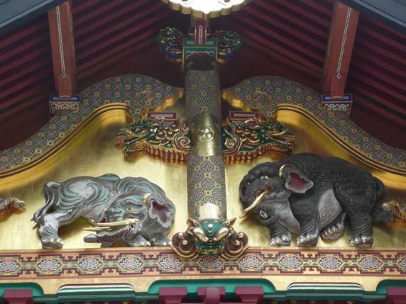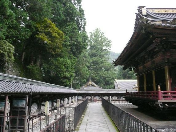tori (Omote-mon) que nos lleva a una gran explanada con tres casas sagradas. El Establo Sagrado decorado con grabados de los tres monos sabios que "no oyen no hablan y no ven", la Biblioteca Sagrada, cerrada al público, y por ultimo una casa decorada con grabados de elefantes hechas por alguien que nunca los había visto.
