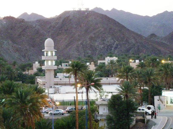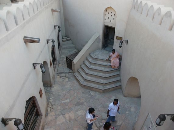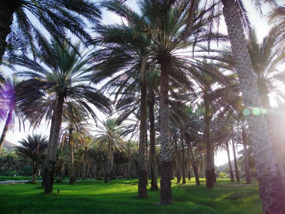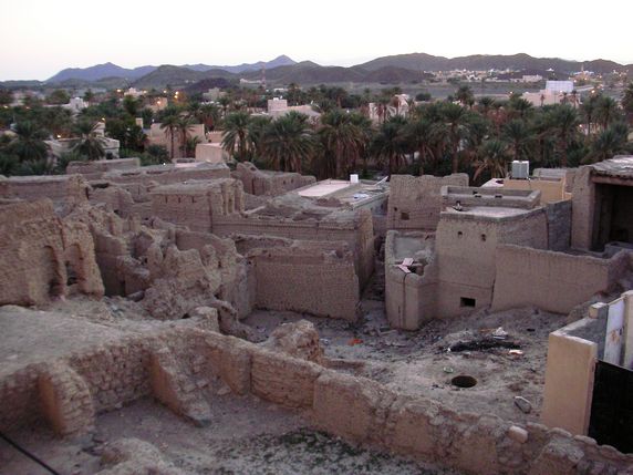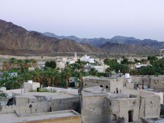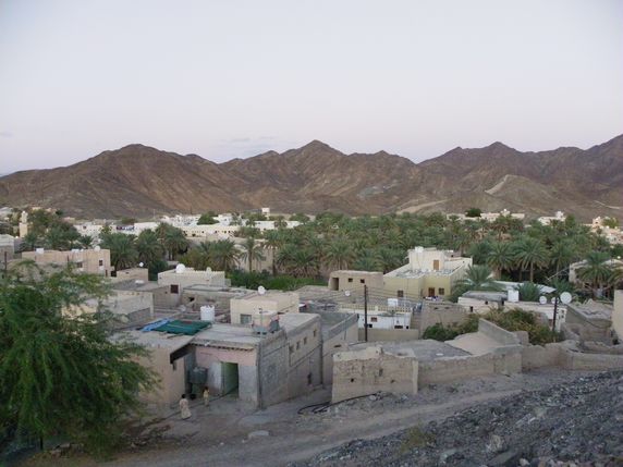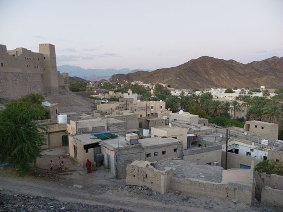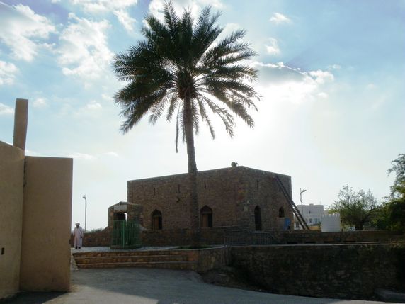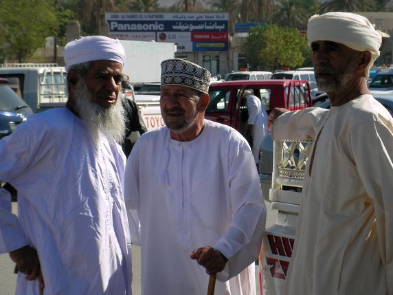 2, propiciando sin duda el crecimiento de las enormes extensiones de palmerales y datileras que rodean el pueblo. Es fácil de encontrar. Tras bordear el castillo por detrás, pasa junto a una inusual mezquita construida en piedra (no en arcilla). Saliendo de ella, un grupo de hombres que se dirigen a tomar un té, nos invitan para que nos unamos a ellos. Así son siempre los omaníes, amabilísimos, cordiales y deseosos de platicar.