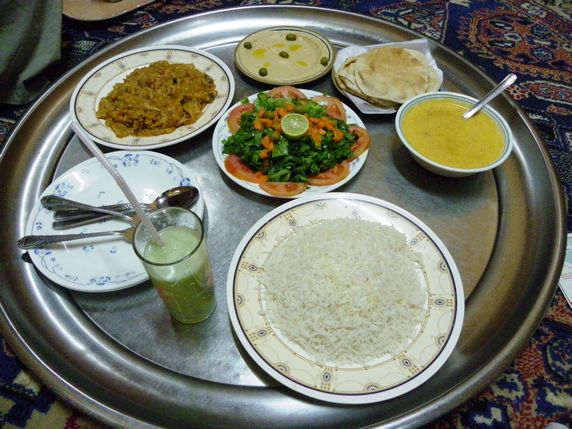 2 donde se entra descalzo. No hay sillas ni mesas, se come sentado en el suelo sobre la alfombra, apoyando la espalda en unos duros y pesados cojines. Hummus (chick peas dip with bread), thereedh samakh (omani bread with fish curry), arus abiyadh ma marak malah nargeel (salted wet fish in coconut curry with rice), salatah makhzooz (special green salad), dos lime mint juice, café omani y dátiles, 7,3 rials. Todo buenísimo. Situado en una calle frente a la mezquita inmediatamente después del aparcamiento.