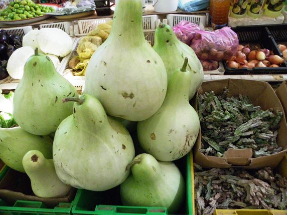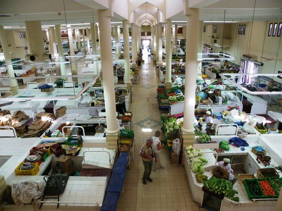 date souq con la esperanza de comprar algunos dátiles. Se trata de un almacén de techos enormes y ventiladores de aspas con cientos de sacos apilados. Debe de ser festivo porque no hay casi nadie en ninguno de los souqs. Los de pescado, carne, cabras y dátiles están desiertos, en el de frutas y verduras están a medio gas o menos. Compramos cuatro tomates (100 baizas) y dos pepinos (100 baizas).