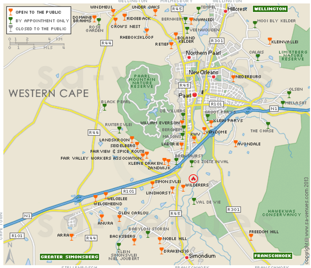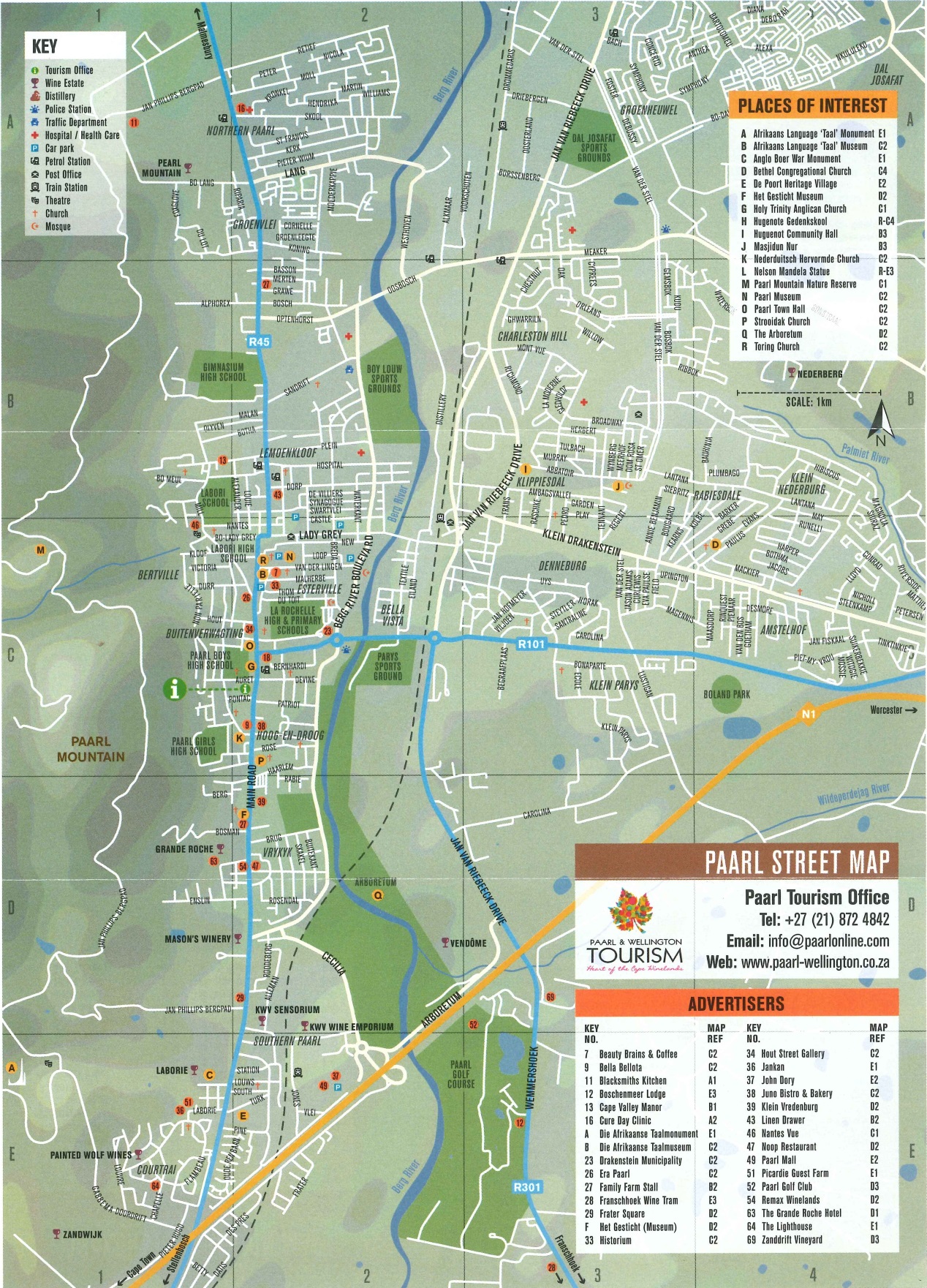 afrikáans. Es un sitio tranquilo, donde algunos edificios clásicos (victorianos, georgianos, holandeses) comparten espacio con los cafés, restaurantes y supermercados a lo largo de una avenida principal de 12 km de largo. Paarl está ubicada en la