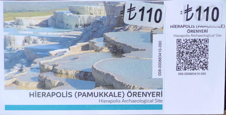 acceso a Hierapolis (incluido el museo pero no las piscinas de Cleopatra) y las piscinas travertinas cuesta 110 TLR. Lo mejor es subir en taxi (30 TLR) hasta la South Gate, visitar Hierapolis, que lleva fácil un par de horas, otro par de horas en los baños de Cleopatra, y bajar "descalzo" por el camino paralelo a las terrazas travertinas una hora más.