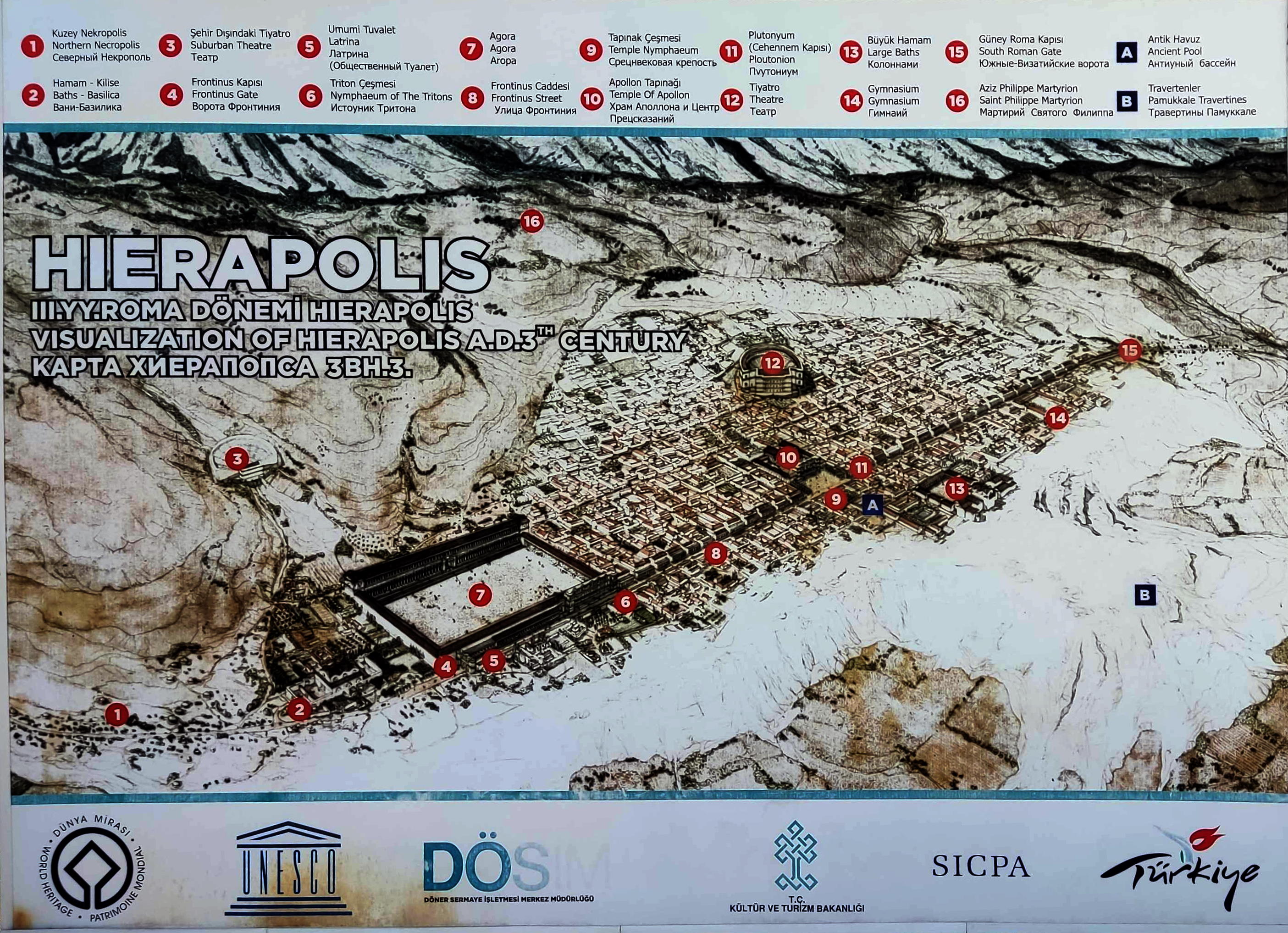 Hierapolis, fundada el siglo II AC, fue una ciudad prospera a pesar de tener que sobreponerse a varios terremotos. Tuvo una fuerte presencia cristiana, como prueba el martirio aquí del apóstol Felipe y sus siete hijos. En el siglo VI el movimiento pagano imperante en la zona arraso con todos los símbolos religiosos, momento en el que empezó una etapa de decadencia que acabo con el abandono de la ciudad, hasta que fue recuperada por arqueólogos italianos a mediados del siglo XX. Entre las ruinas actuales se han restaurado las antiguas