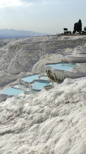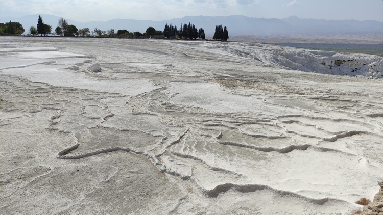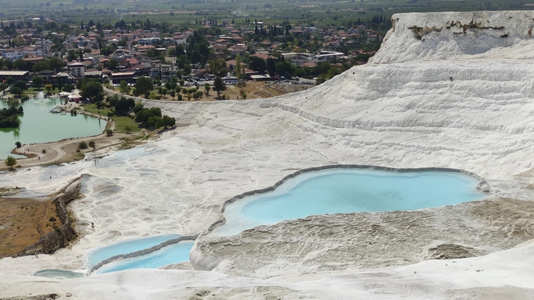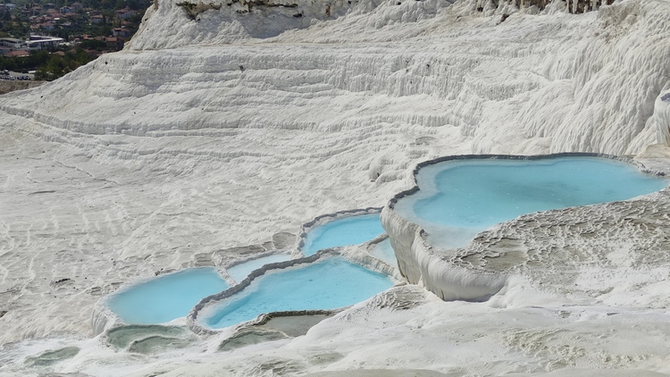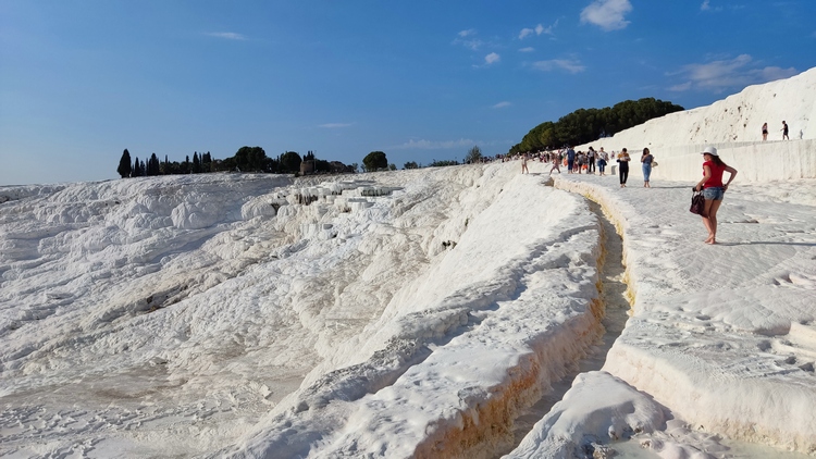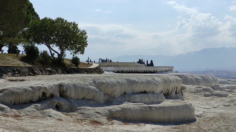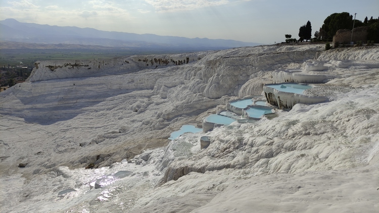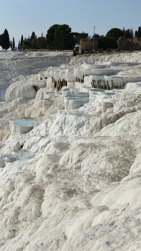 terrazas travertinas que descienden durante 500 metros hasta el pueblo, sobre un resbaladizo suelo calcáreo de intenso color blanco. A medida que el agua termal sube por el borde de la meseta y se enfría, se desprende dióxido de carbono y la tiza dura, también conocida como travertino, se acumula como una cascada solidificada, avanzando lentamente hacia el suroeste. Hay que descalzarse para acceder, no se permite calzado de ningún tipo, aunque si que está permitido el baño en las terrazas, que cubren en sus zonas más profundas apenas dos palmos. El agua es de un denso color blanco que no permite ver el fondo y además está caliente como un meado de burra, pero es una experiencia interesante.