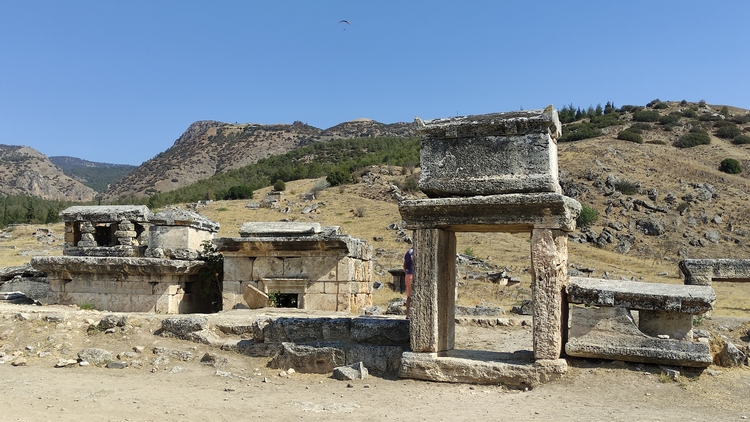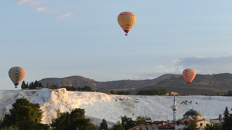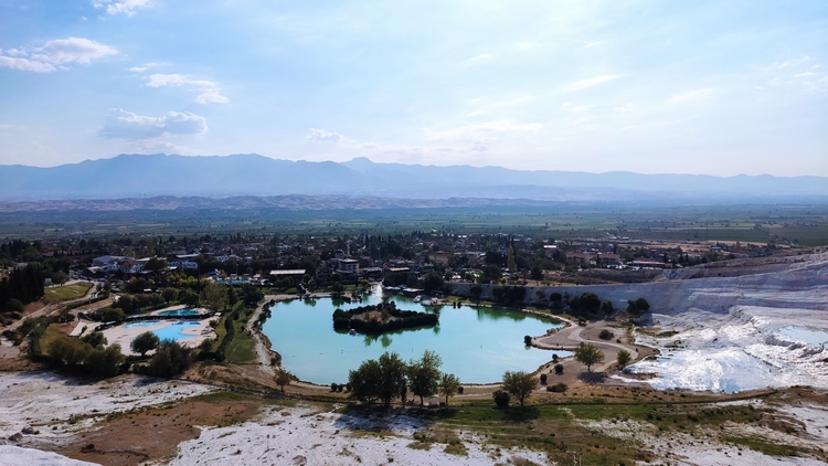 Pamukkale, lugar conocido por sus terrazas de travertino, creadas por las aguas termales que brotaban de la antigua ciudad greco romana de Hierapolis, cuyas extensas ruinas merecen también una visita. El pueblo más cercano que recibe el nombre de