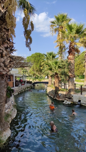 Piscinas de Cleopatra, unos baños termales actualmente abiertos al público (100 TLR) que disponen de cambiadores y taquillas para guardar la ropa. En la zona hay una área de descanso a la sombra y opciones para comer, al doble o el triple que en el pueblo.