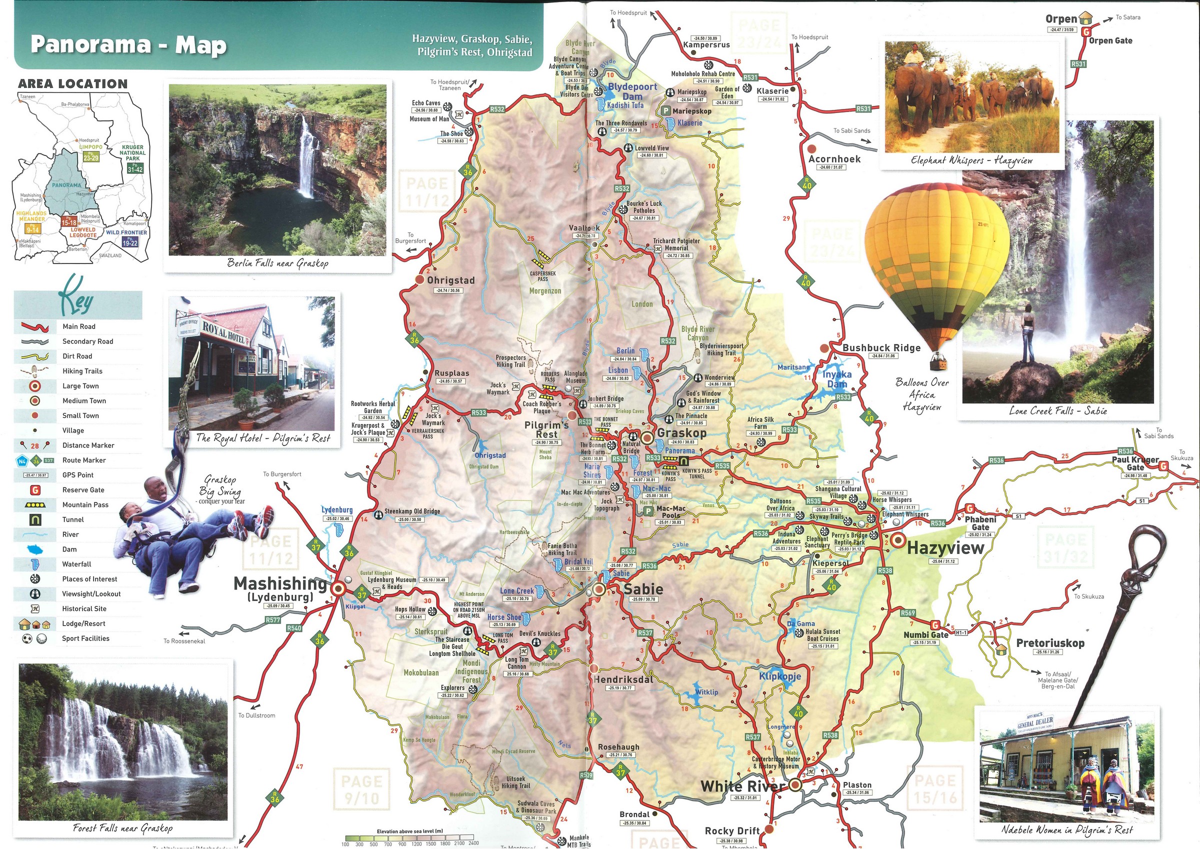 Panorama Route es una ruta escénica para recorrer en coche centrada alrededor del Blyde River Canyon, que con sus 25 km de longitud y 1440 mts de profundidad, es el tercer cañón más largo del mundo. A diferencia de otros cañones, este es completamente verde, las escarpadas montañas son un manto verde de frondosos bosques, donde abundan las cascadas de agua y los acantilados. Muchos pueblos, asentimientos mineros erigidos durante la fiebre del oro de finales del XIX, retienen una rica herencia cultural. Es una carretera de un solo carril bien señalizada y con poco tránsito, lo que más vemos son furgonetas usadas como taxis compartidos Aunque el número de atractivos es enorme, y da para pasar varios días, nosotros solo le veremos los principales, los más próximos a la carretera en nuestra ruta hacia el parque Kruger.