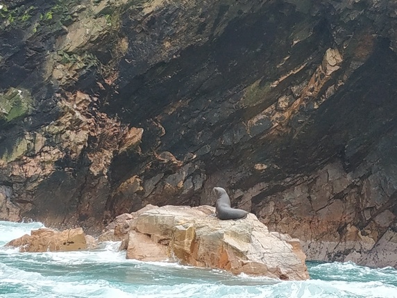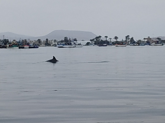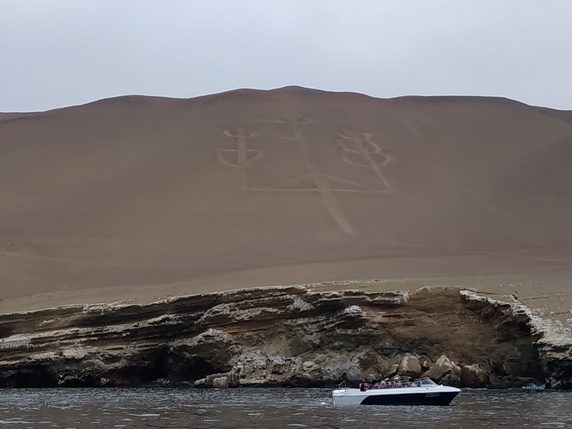 Islas Ballestas, 08:00, 2h de visita. Están a unos quince minutos de la costa. Nada más dejar el puerto vemos una docena de delfines y algunos lobos marinos. Por el camino, en la ladera de una colina, vemos un geoglifo gigante en forma de candelabro, que los marineros solían usar como punto de referencia, nadie conoce su origen y se le estima una edad de unos 200 años, seguramente fue dibujado por piratas.