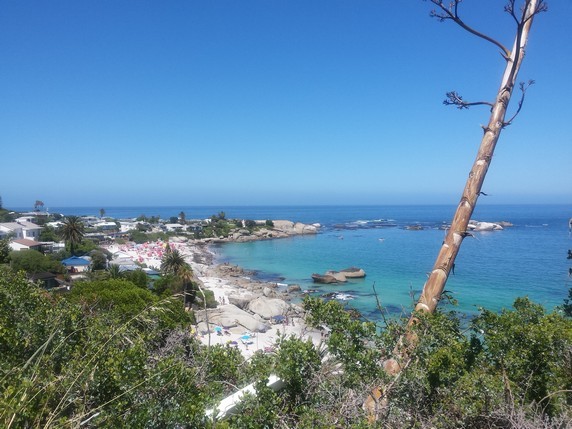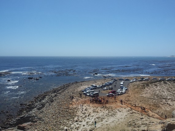 Para salir del Cape Town seguimos Kloff Road dirección sur, a nuestra derecha queda el océano y una sucesión sin fin de pequeñas playas y tranquilas calas. Dejamos el coche en el margen de la carretera, siempre vigilado por los omnipresentes guardacoches, y bajamos a ver alguna de ellas. Aunque son playas de arena, la costa es muy rocosa y en los primeros metros de agua es fácil encontrar piedras. También hay restos de