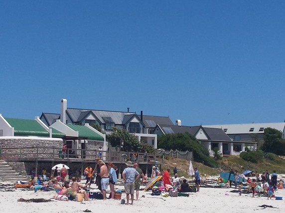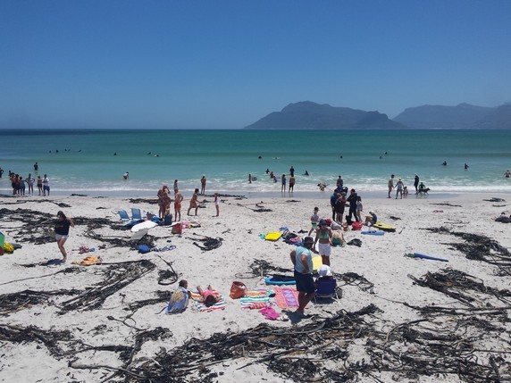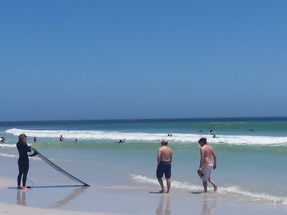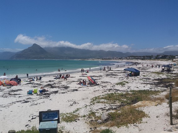 Kommetjie, donde bajamos a dar un paseo por la playa y tomar un helado. Es una zona muy popular entre los aficionados al surf, y a pesar de los carteles que avisan del riesgo de tiburón blanco, el agua está llena de bañistas y surfistas. En la arena, entre los bañistas que toman el sol, hay restos de algas