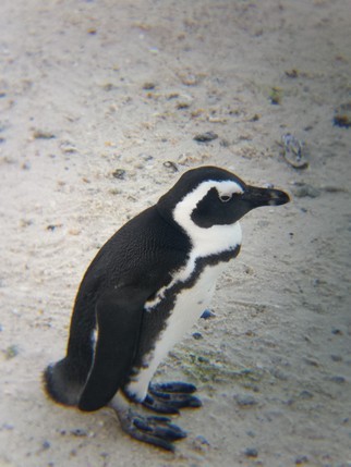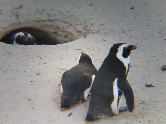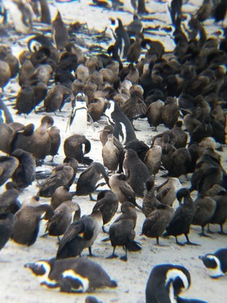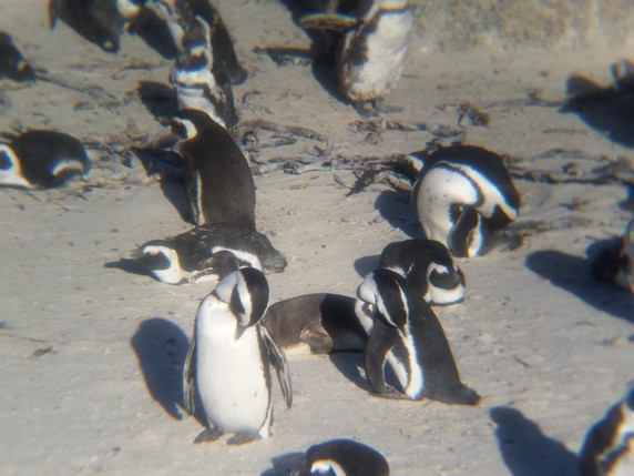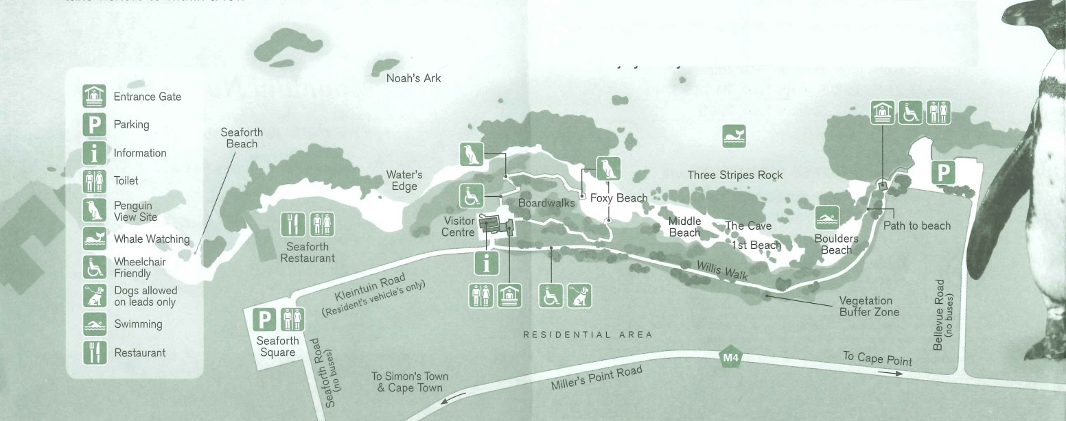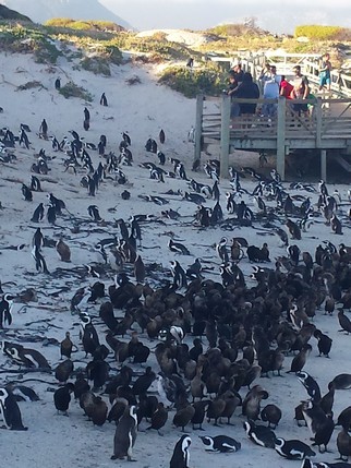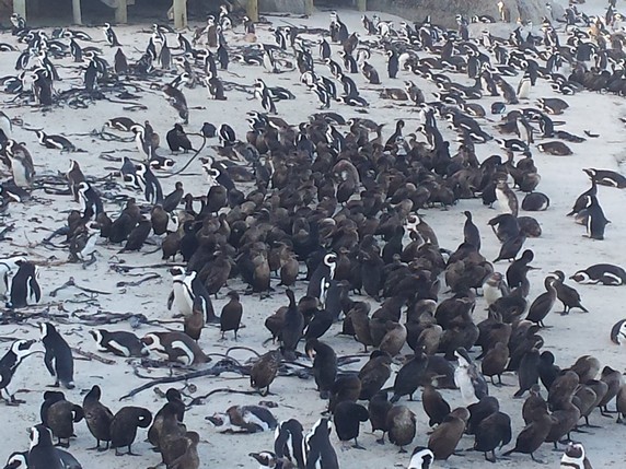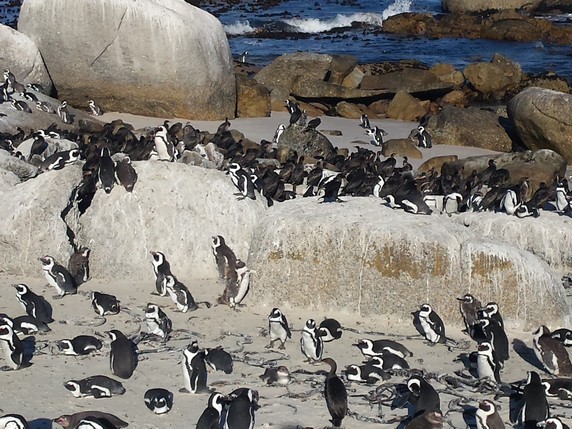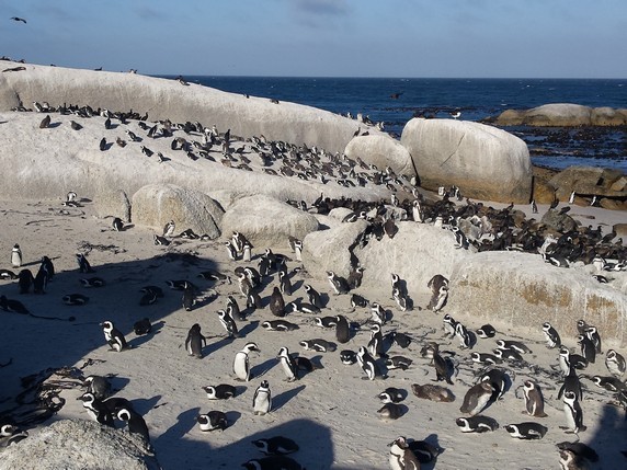 boulders), que se ha hecho famosa por su prospera colonia de pingüinos del cabo que habitan en esta zona protegida del viento. Aunque está en medio de un área residencial, es uno de los pocos sitios donde pueden ser observados de cerca en un área natural protegida. Favorecida por la prohibición de la pesca de arrastre en la zona, que ha incrementado los bancos de sardinas, la colonia alcanza hoy día los 2.000 ejemplares. Desde el centro de visitantes (acceso 70 rands, gratis con Wildcard) unas pasarelas de madera dan acceso a tres puntos de observación.