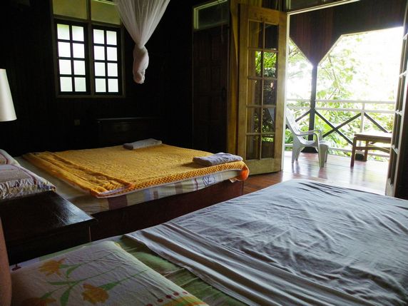 Impiani Resort, en Pulau Perhentian Kecil. 150rm. Bonito bungalow de madera, espacioso y muy luminoso, tres camas, aire acondicionado, lavabo simple pero correcto, y balcón equipado con dos sillas y mesita. Camuflado en la jungla con vistas al mar, convivimos con ardillas, geckos e insectos varios. El resort dispone de un bonito restaurante con