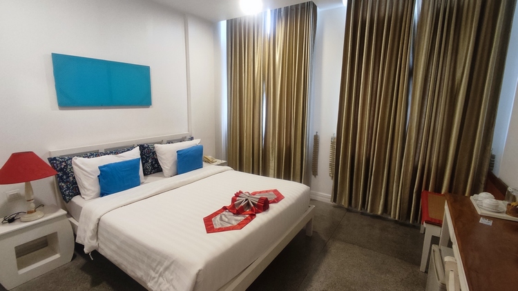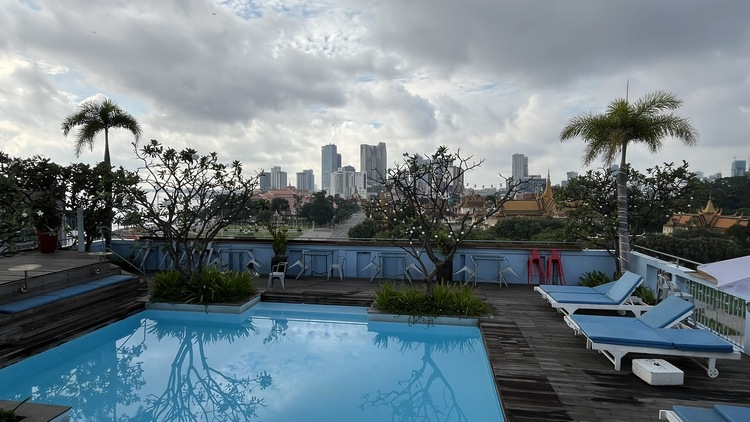The Frangipani Royal Palace, 35$, desayuno incluido. Muy buena ubicación junto al río y frente al palacio real. Habitación doble cómoda y espaciosa con baño privado. En la azotea dispone de piscina y restaurante con muy buenas vistas. Tienda de calidad muy bien surtida. Servicio cuatro estrellas.