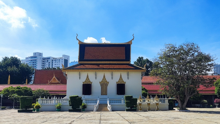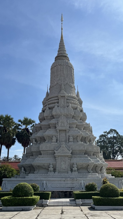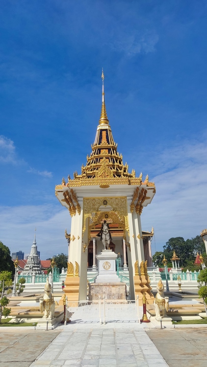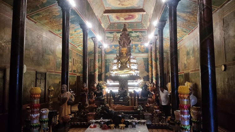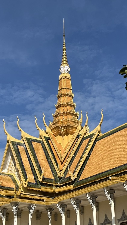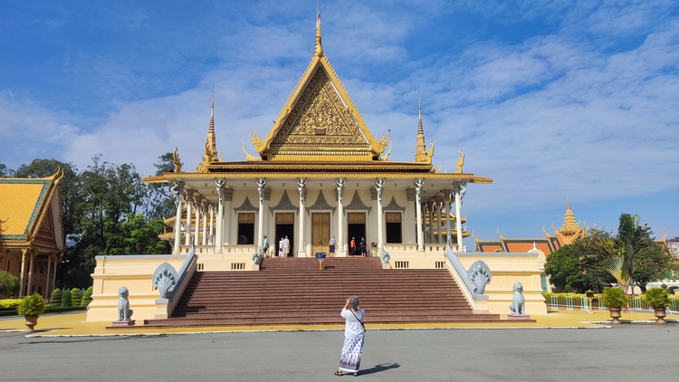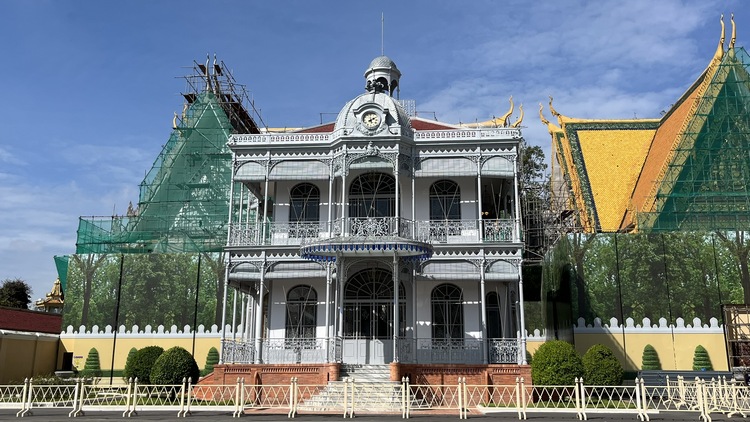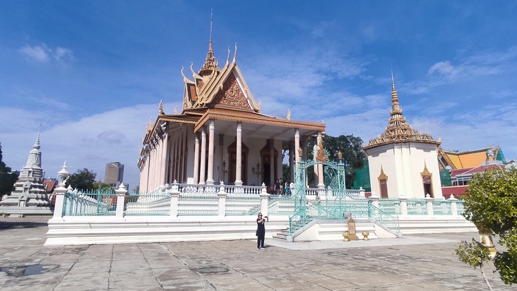El Palacio Real (acceso 10$) es la residencia oficial de los reyes de Camboya desde 1866, por lo que algunas zonas están cerradas al público. Ya desde fuera, antes de acceder al recinto amurallado, pueden verse los tejados de estilo jemer, puntiagudos y dorados. Hay tres secciones principales: la Pagoda de Plata, donde se encuentra el Buda Esmeralda y otra estatua de Buda de tamaño real con más de 9.000 diamantes; el Palacio Khemarin, residencia del rey de Camboya; y la Sala del Trono, usada para coronaciones, la mayoría de los objetos que albergaba fueron destruidos por los jemeres rojos. Llama la atención el Pabellón de Napoleón III, un edificio de dos plantas de estilo europeo y balconadas de hierro, que parece colocado aquí por error.