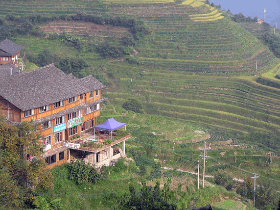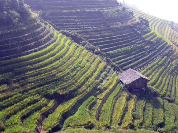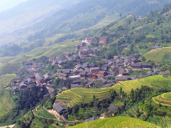 Las Terrazas de Arroz de Longji, 100 km al norte de Guilin, son probablemente uno de los paisajes más bonitos de China. Ocupan un extensión de 66 km², y son el resultado de cientos de años de trabajo de las minorías Zhuang, Yao y Dong. Empezaron a construirse hace 800 años durante la dinastía Yuan y se terminaron durante la dinastía Qing. El paisaje es sobrecogedor, fueron construidas aprovechando toda la ladera de la montaña, desde la orilla del río hasta la cumbre. El punto más elevado esta a 885 metros y el más bajo a 380, variando el ancho de las terrazas entre apenas un palmo y varios metros. Cualquier espacio se aprovecha. Los campos son regados desde ríos y arroyos de montaña, mediante