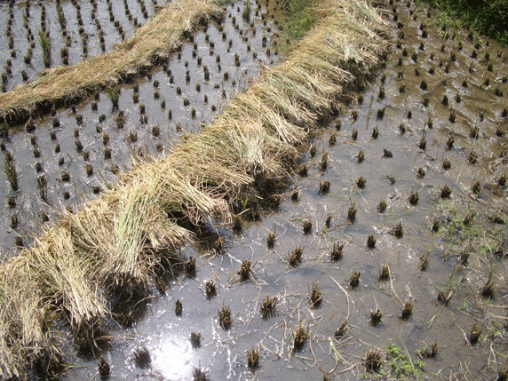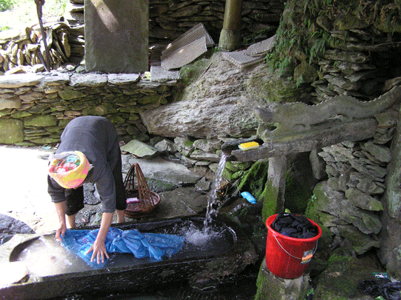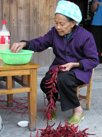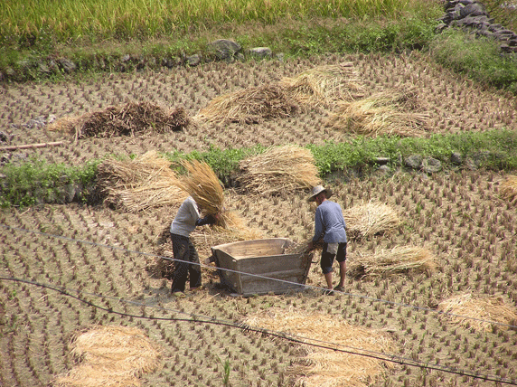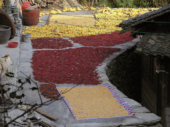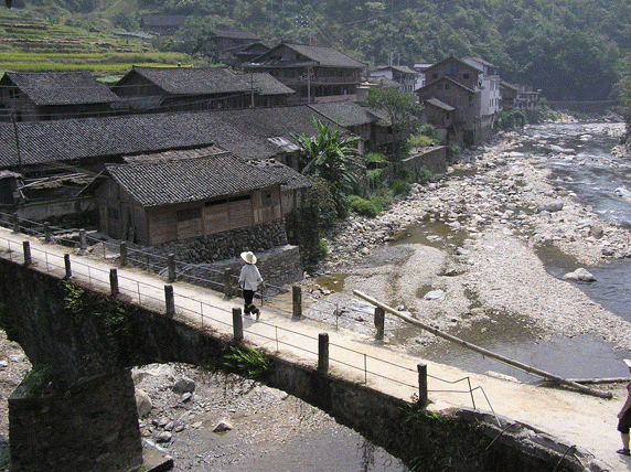 Longji. Es un pequeño pueblo similar a los otros de la zona, casas de madera y caminos empedrados. Llaman la atención una fuente en forma de dragón y un molino de agua. Hay también una bonita plaza arbolada donde reposar un rato. Montaña abajo, una hora más tarde, ya se ve el pueblo de Jinjiang, tan solo hay que cruzar un puente. Durante todo el camino hemos visto gente trabajando en los arrozales, es época de siega, el paisaje es más intenso, más amarillo, aquí el camino esta dentro de los mismos arrozales. A pie de carretera, junto al puente, hay un par de sitios básicos donde poder comer algo. Por