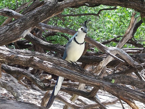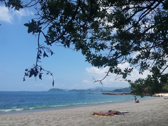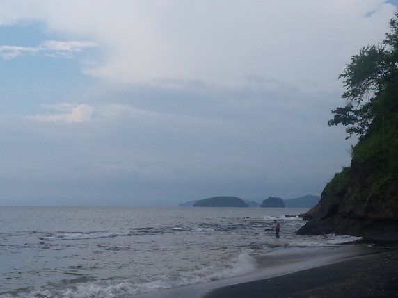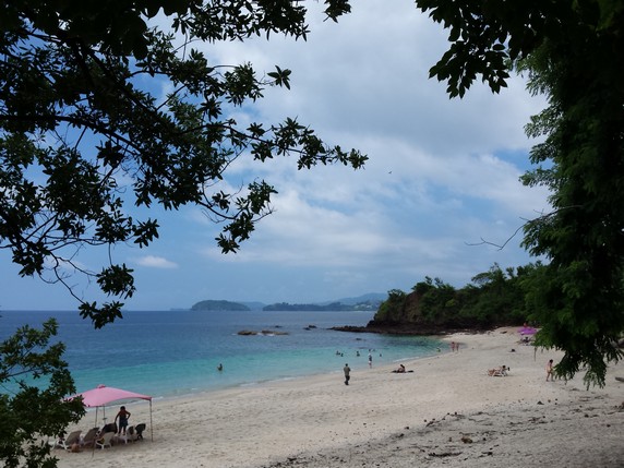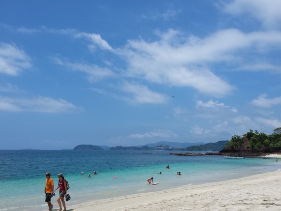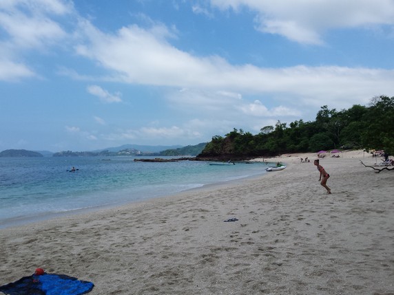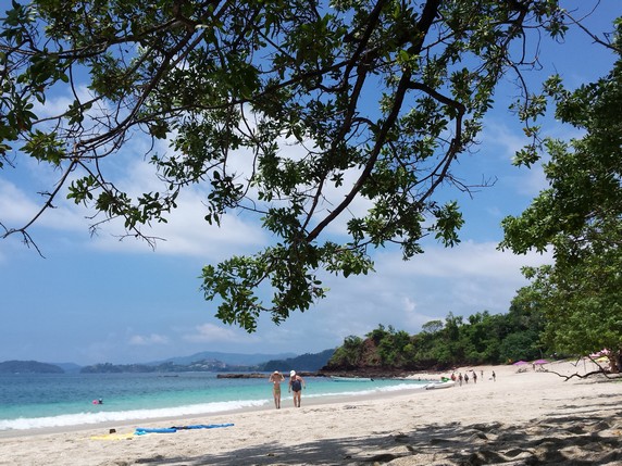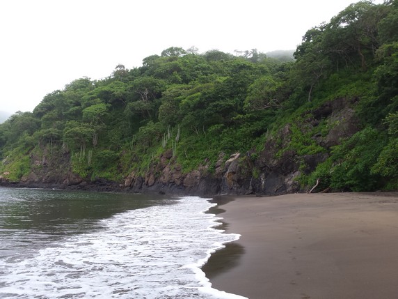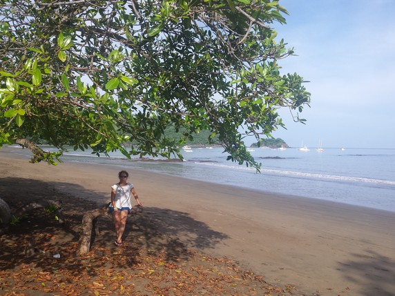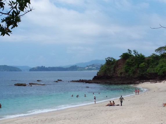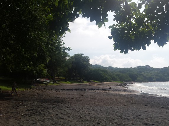 Playa Conchal. A una de hora de Playas del Coco, 38 km, la mayor parte por pista sin asfaltar. Hay que tener presente un desvío que lleva hacia un pequeño puente de madera y que evita vadear el río por dos puntos. Nosotros nos lo saltamos a la vuelta, el primer tramo tiene un palmo de agua y se pasa bien, el segundo es algo más profundo y el agua pasa más rápida de lo que parece, marcha corta, gas a fondo y no acojonarse, si no te quedas. La playa está junto a un pueblo que se llama Brasilito, puedes dejar el coche allí y caminar 15 minutos por la playa hasta Conchal, o seguir por la arena 500 metros hasta playa Conchal y aparcar allí. En cualquiera de los casos habrá alguien atento para cobrarte 3.000 colones por estacionar. La playa en si es espectacular, el bosque llega hasta la orilla, ofreciendo sombra a pocos metros del agua. Recibe el nombre porque su arena está compuesta en un 98% de restos de conchas trituradas, la mayoría de ellos milimétricos. Las conchas siguen dentro del agua, en una zona que cubre hasta las rodillas, cuando empieza la arena la profundidad cae a dos metros en solo un palmo. La playa, a pesar de ser la más popular de la zona está vacía, nadie está al sol, solo las sombras están ocupadas, y aun así y todo nuestro vecino más cercano se encuentra a diez metros. En cuanto al