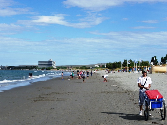 playa es ancha y larga, de piso firme pero cómodo, apenas hay olas y el acceso al agua parece fácil y poco profundo. A pesar del frío hay gente bañandose, jugando a futbol, tomando el sol, y churreros ambulantes endulzando a los paseantes. Tardamos una hora, a ritmo relajado, en recorrer los tres kilometros que hay hasta el