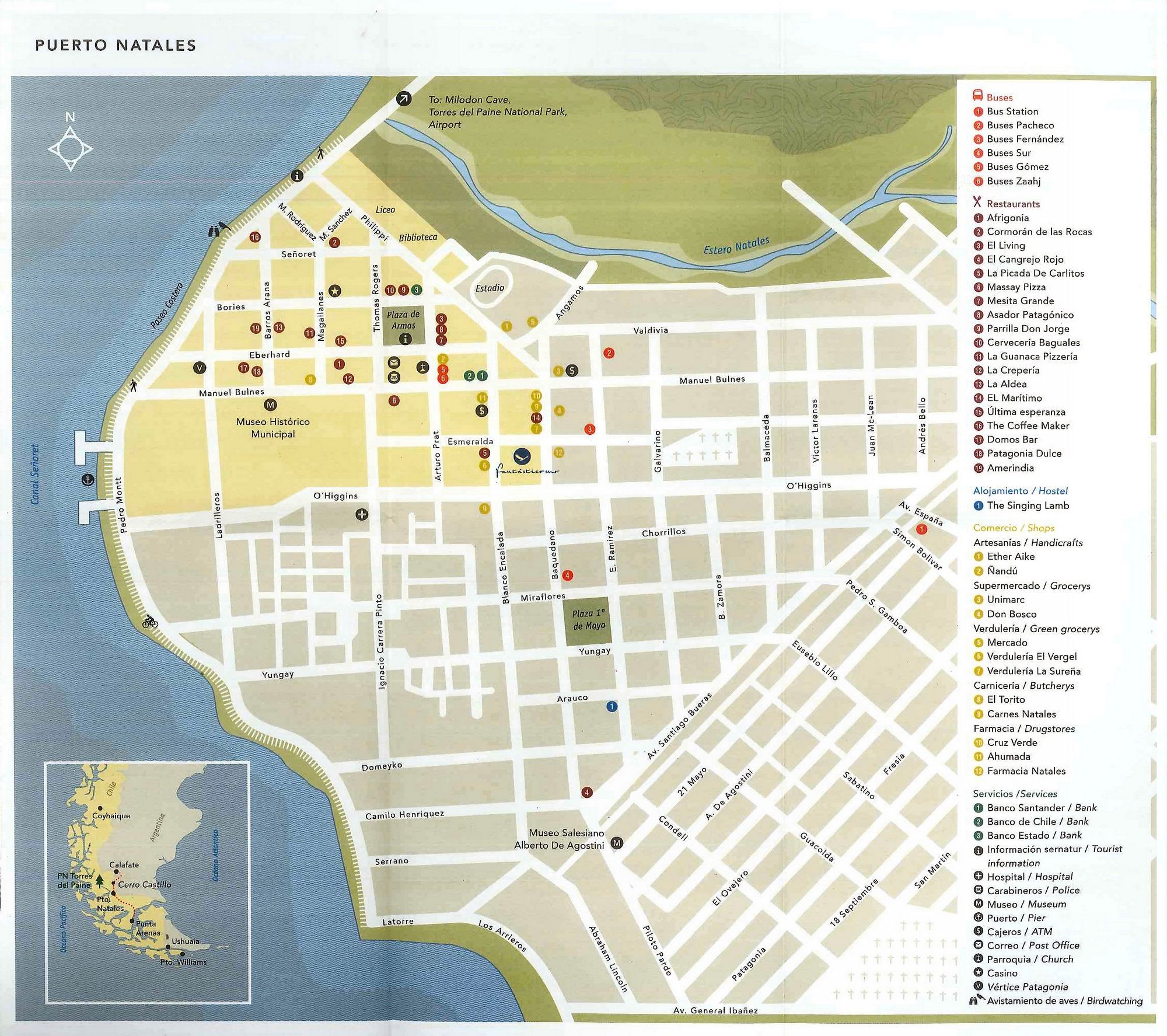souvenirs, restaurantes, hoteles y casas de huéspedes, incluso hay casas particulares que alquilan habitaciones. A pesar de ello es un lugar muy tranquilo, barrido por fuertes vientos, a orillas del fiordo Última Esperanza, citado así por el navegante español Juan Ladrillero, quien en uno de sus viajes al ver frustradas sus opciones de encontrar el Estrecho de Magallanes.