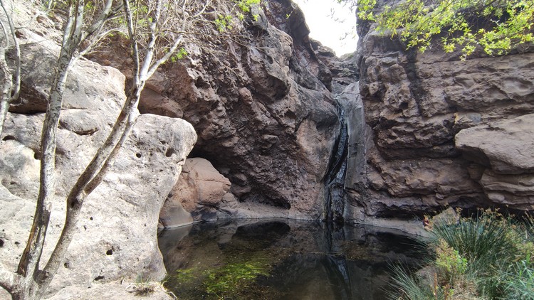 Sendero de el Charco Azul, uno de los pocos rincones de la isla con agua todo el año. En época de lluvias cae una cascada sobre él, y hace que avance el agua a lo largo del barranco. Para llegar a el hay que seguir un sendero cómodo y llano, de unos dos kilómetros de longitud, que discurre paralelo al cauce del barranco, así que se va viendo agua (escasa cuando estuvimos) durante todo el camino.