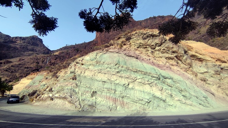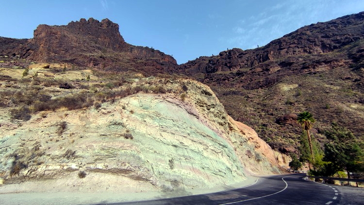Azulejos de Veneguera, una paleta multicolor dibujada directamente sobre la montaña, resultado de un complejo proceso de solidificación de los fluidos hidrotermales que expulsó el volcán de Tejeda y que la erosión de miles de años ha dejado al descubierto.