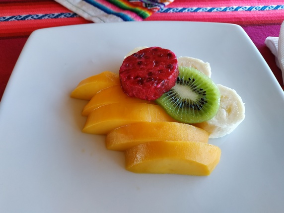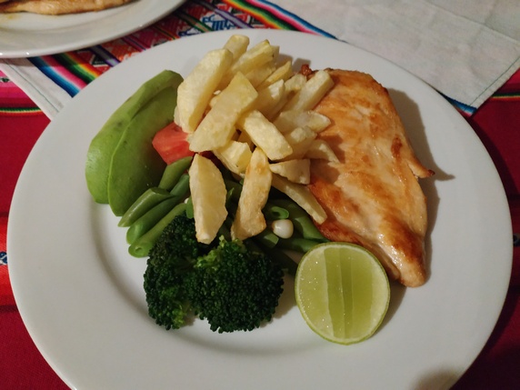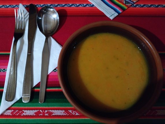 A las 19h cena, sopa de espárragos y verduras, pollo plancha con aguacate y tomate, de postre pancake de melocotón. Por la noche bajan mucho las temperaturas, nos ponen tres botellas de agua caliente a los pies de la cama y una manta extra, a pesar de que el edredón es bien grueso, y además nos aconsejan dormir con chullo (gorro). No pasamos nada de frio.