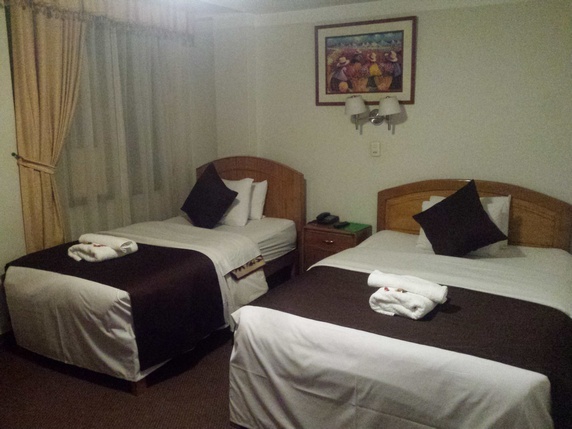 Hotel Balsa Inn. Habitación grande y cómoda, pero sencilla, con cama doble, moqueta, secador de pelo, nevera y calefacción. Desayuno incluido: embutidos, frutas, yogurt, zumos, mantequilla y mermeladas. A un minuto de la Plaza de Armas