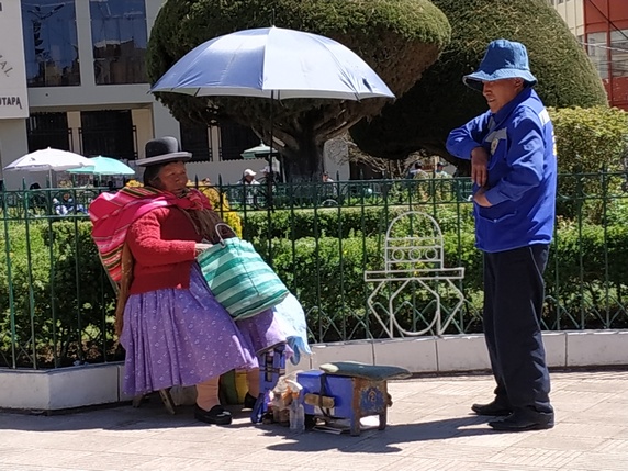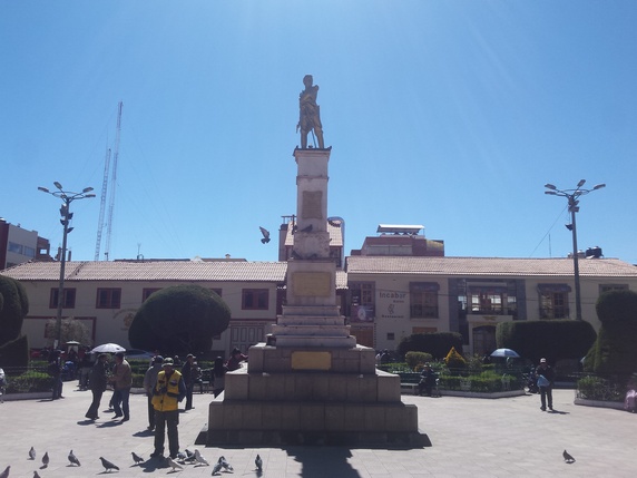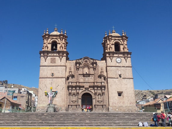 Puno, a diferencia de las ciudades que hemos visitado hasta ahora, sus habitantes son mayoritariamente de origen aymara. Rodeada de cerros, a orillas del lago Titicaca, fue fundada en 1666 a una altitud de 3819 mts. La mayoría de los turistas que llegan lo hacen para visitar el lago, y prestan poca atención a la ciudad. Seguramente se merece al menos un día entero, pero no pudo ser. Nosotros visitamos la Plaza de Armas y sus alrededores. La plaza queda dividida en dos por la calle Ayacucho. A un lado queda la Catedral del siglo XVIII, bastante bonita por fuera pero austera por dentro, al otro están el Palacio de Justicia, la Municipalidad y un lado donde solo hay bares y restaurantes. De una esquina nace el Jirón Lima, una calle peatonal llena de tiendas de souvenirs, casas de cambio y restaurantes, que se prolonga durante tres o cuatro cuadras hasta Parque Pino, donde está la Iglesia de San Juan.