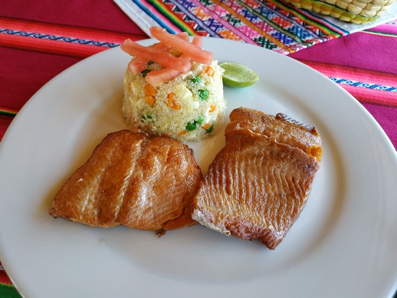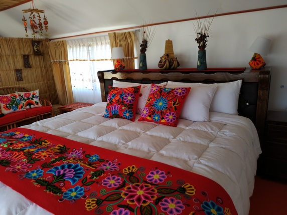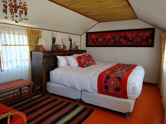 break en el viaje. De comer tenemos sopa de verduras, trucha con quínoa y ensalada de frutas, todo delicioso. Después nos damos una buena siesta y leemos un rato. La hermana de Cristina viene desde otra isla para vender artesanía local, y vestirnos con ropas tradicionales, con las que nos hacemos unas fotos. Compramos un tapete para la mesa del comedor.