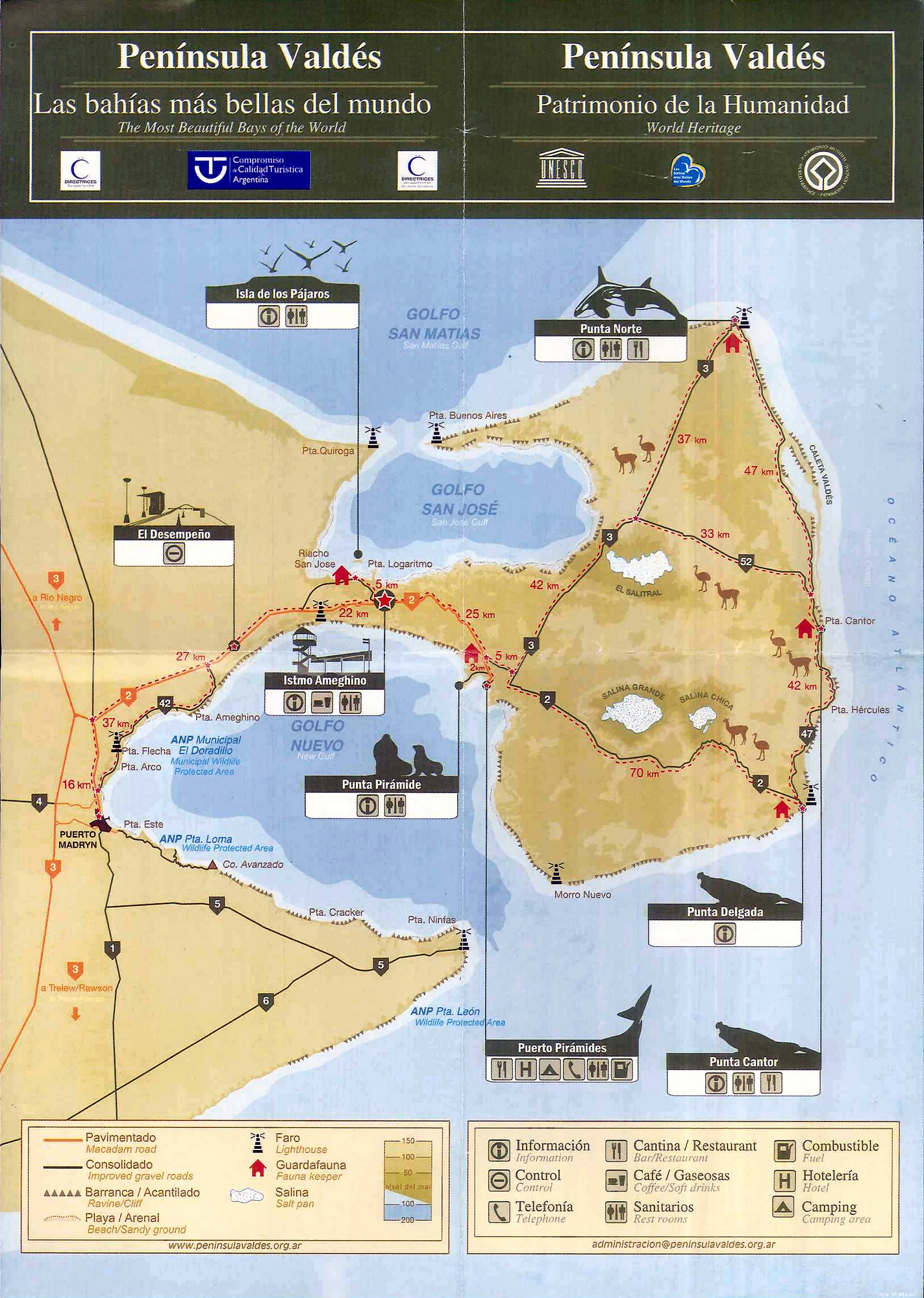 Península Valdés es una reserva natural protegida situada l norte de Puerto Madryn, una serie de bahías, golfos, playas y acantilados sobre el mar. Es una zona mas bien árida, donde predomina la estepa con arbustos bajos y gramíneas. En cuanto a fauna, es zona de reproducción de varias especies de mamíferos marinos, y hábitat de una alta diversidad de aves marinas y terrestres. En la época adecuada pueden avistar ballenas a escasos metros de la costa. Además es fácil ver zorros, guanacos, ñandus petisos (similar a un avestruz), martinetas, maras y liebres europeas.