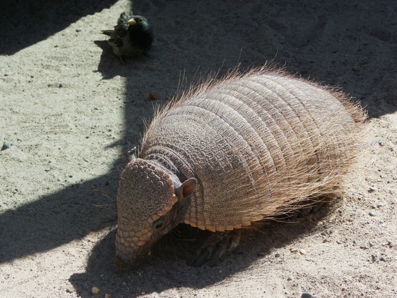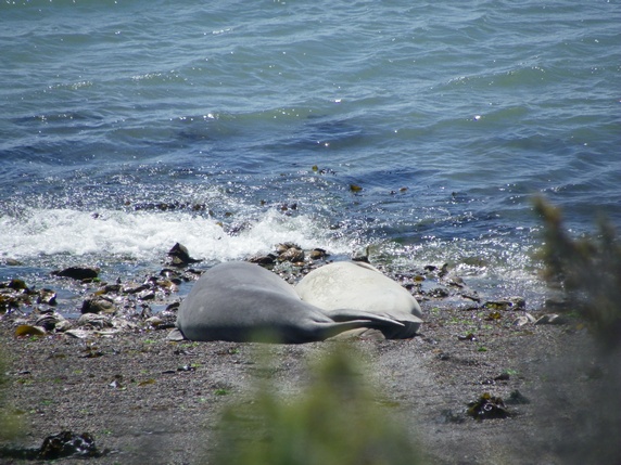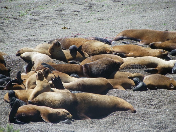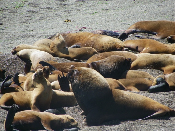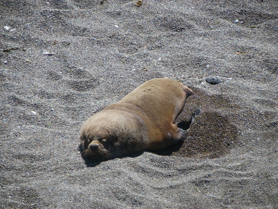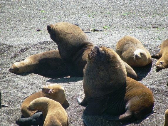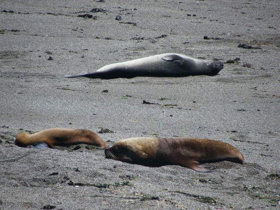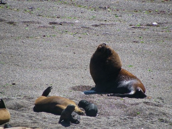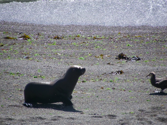 Punta norte. Aquí hay una importante colonia de cría de lobos marinos en verano, y de elefantes marinos en primavera. Dicen que entre octubre y abril pueden avistarse orcas en días de mar calma, nosotros no vimos ninguna. Lo que si vimos solo bajar del coche fue un armadillo peludo. Desde una pasarela elevada 15 ó 20 mts sobre la playa, y de unos 300 mts de largo, se ve una playa llena de lobos marinos (color marrón negruzco) y algunos elefantes marinos (color gris claro y mucho mas grandes). Entre los lobos hay muchas hembras y crías amamantando, algunos machos se pelean de tanto en tanto, otros se tiran arena por encima para refrescarse. También hay una cría muerta que está siendo devorada por los petreles. Aunque los animales se ven sin dificultad se agradecen unos prismáticos, y para fotografiarlos es mejor con un buen zoom.