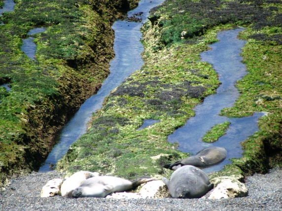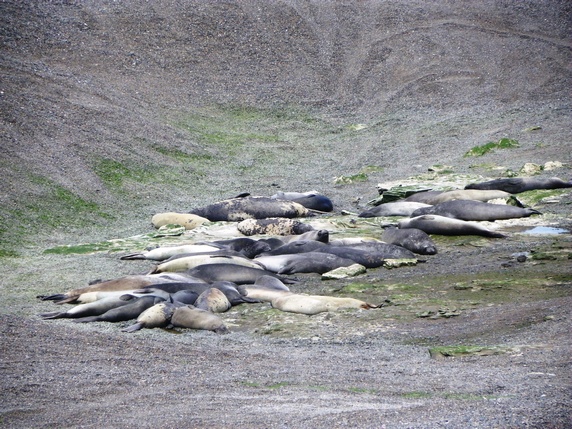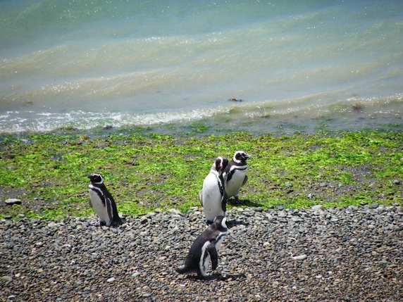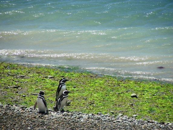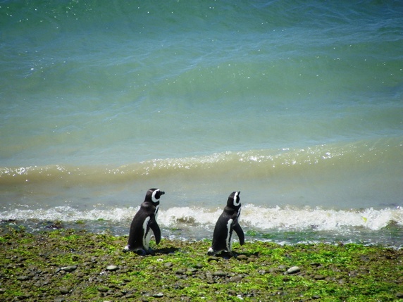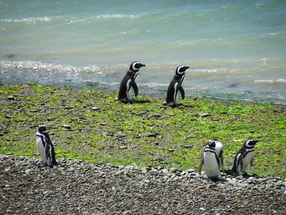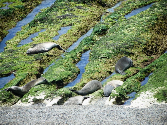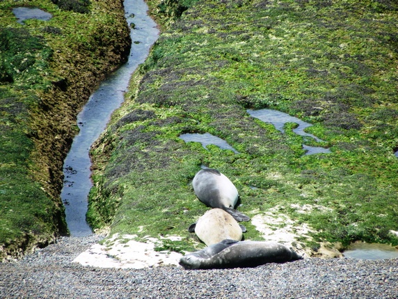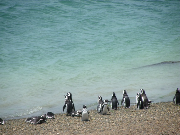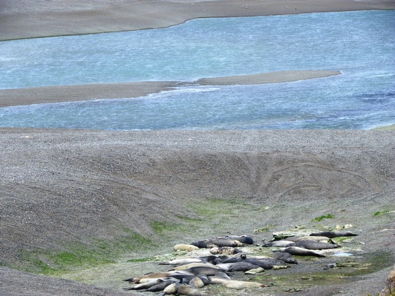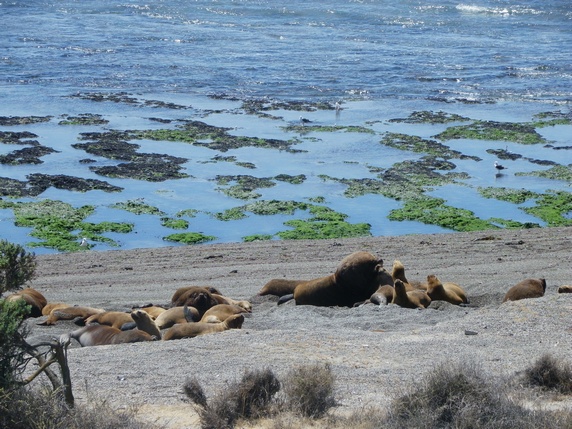 A casi 1h de camino está Caleta Valdés, una delgada franja de tierra y arena, que encierra una porción de mar conectada por una pequeña boca con el océano. Aquí hacemos dos paradas. Primero visitamos un pingüinera que se extiende caleta abajo desde el mirador hasta la playa. Algunos nidos quedan realmente cerca, aunque la mayoría de los animales están en la orilla. Poco mas allá en una zona de aguas tranquilas, protegidos del mar y del viento por unos singulares acantilados, abruptos y verdosos, limados por la erosión, hay una colonia de elefantes marinos, que vemos tumbados al sol, prácticamente inmóviles, parecen mas a una enorme roca blanca que un ser vivo. El contraste con el color del mar y los acantilados es impresionante.