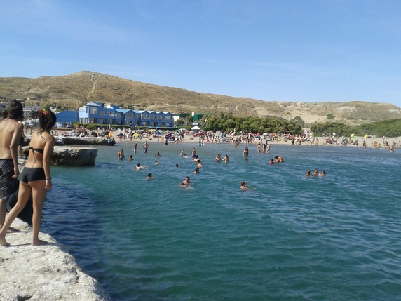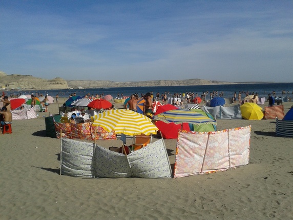 Puerto Pirámides. Parada paraa comer y pasear por la playa. Pueblo de 500 habitantes totalmente dedicado al turismo, la mayoría de él por lo que vemos nacional. Es una ensenada con agua poco movida, y cómoda para bañarse y jugar con la familia. A pesar del viento, para hoy había pronósticos por encima de 30 nudos, no se vuela ni una sombrilla, son unos auténticos profesionales. Es el único lugar de Península Valdés donde, entre los meses de junio y diciembre, se realizan salidas en barca para ver a la ballena franca austral.