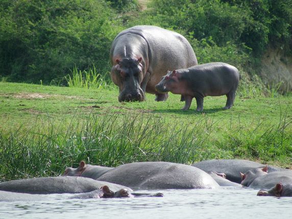 del lago George, frente al pueblo de Kasenyi, vemos hipopótamos,