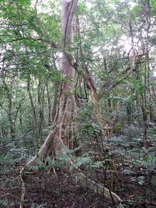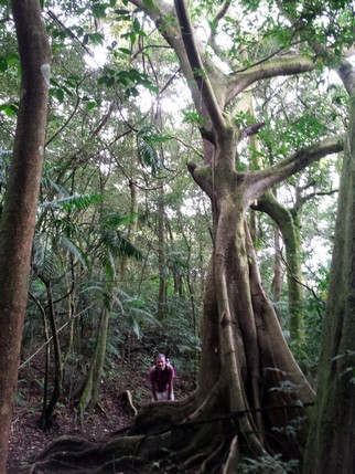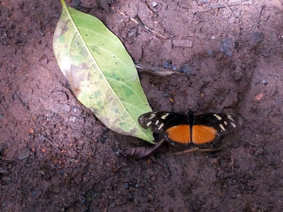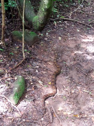 Estamos rodeados de un bosque húmedo y denso que apenas deja pasar la lluvia, el suelo está lleno de hojas en descomposición, los troncos tintados de musgo, y hay pequeños charcos formados por las fuertes lluvias de anoche. Hay arañas de un tamaño considerable, todos los insectos habidos y por haber, pequeños lagartos, sapos, monos aulladores y monos araña, incluso una boa constrictor de dos metros en el sendero principal. También habitan jaguares y pumas, pero por desgracia no nos tocó el premio gordo.