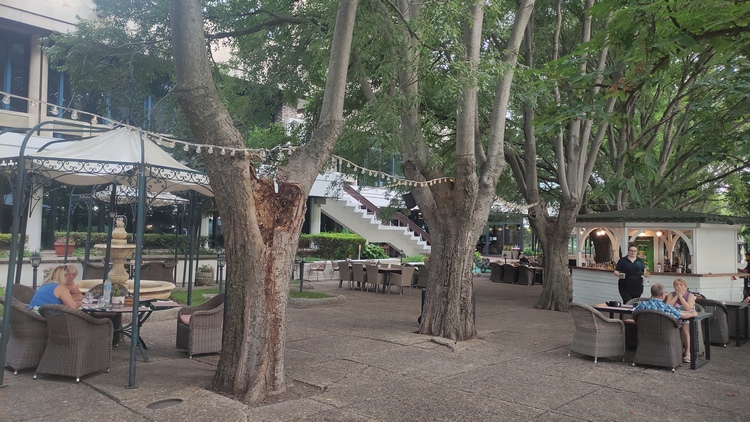 Garden, restaurante ajardinado, con fuentes de agua, música relajada y vistas al Danubio, ubicado en los bajos del
