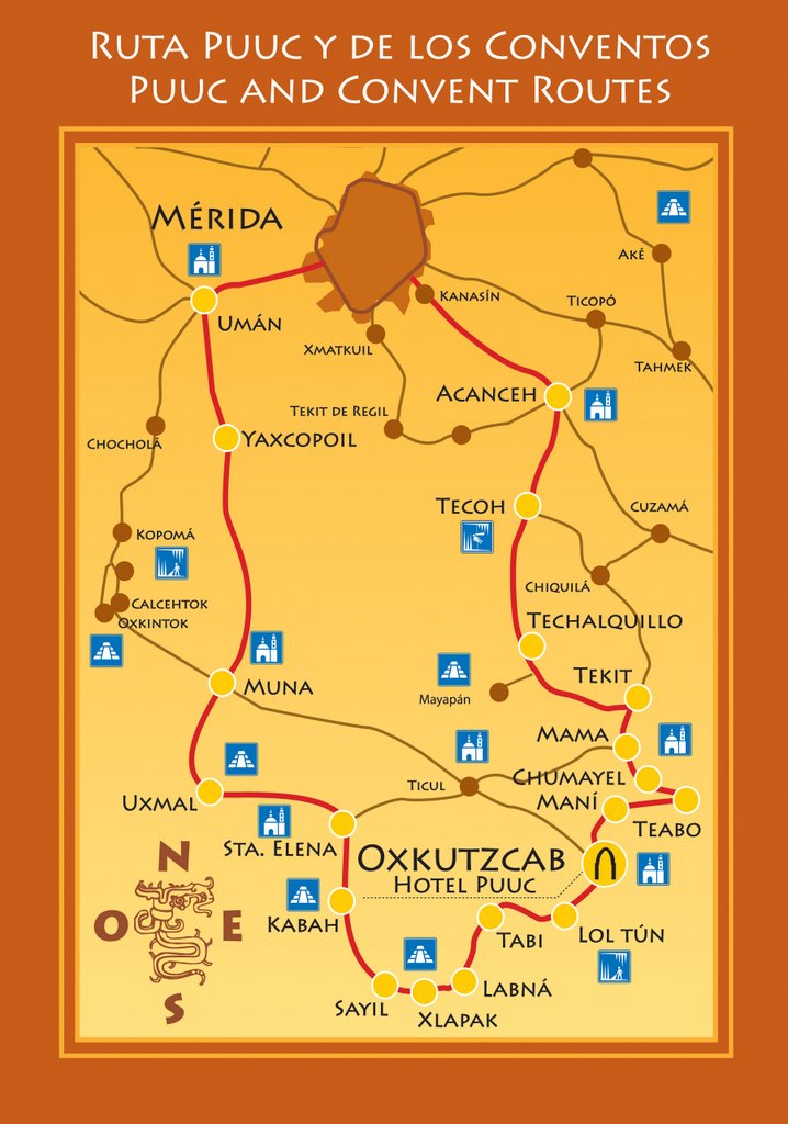Ruta Puuc es el nombre oficial dado a un tramo de carreteras secundarias de 40 km en esta zona del Yucatán, que unen restos de antiguas urbes mayas que compartían un estilo común y propio, más exquisito y cuidado, el estilo puuc. Este estilo se caracteriza por la elaborada ornamentación de las fachadas de templos y palacios, utilizando piedra caliza extraída en la región. Básicamente las zonas arqueológicas que forman esta ruta son las grutas de Calcehtok y de Loltún, y las zonas arqueológicas de Acanceh, Oxtintok, Xlapak, Sayil, Labná, Kabah y Uxmal, la joya del puuc.