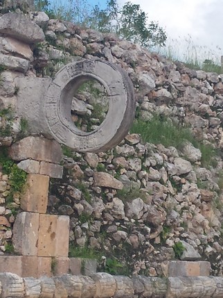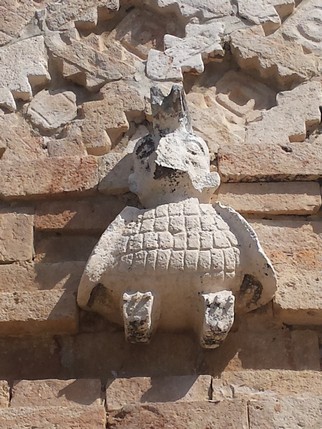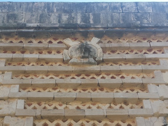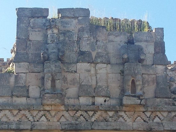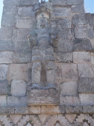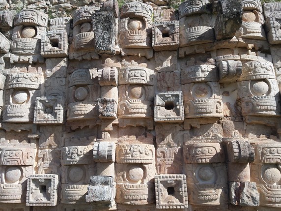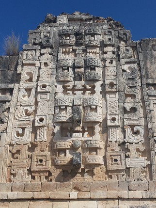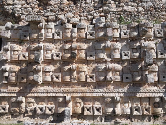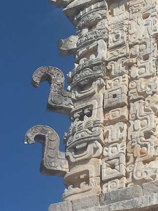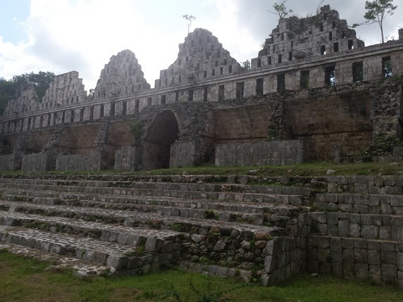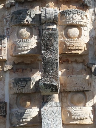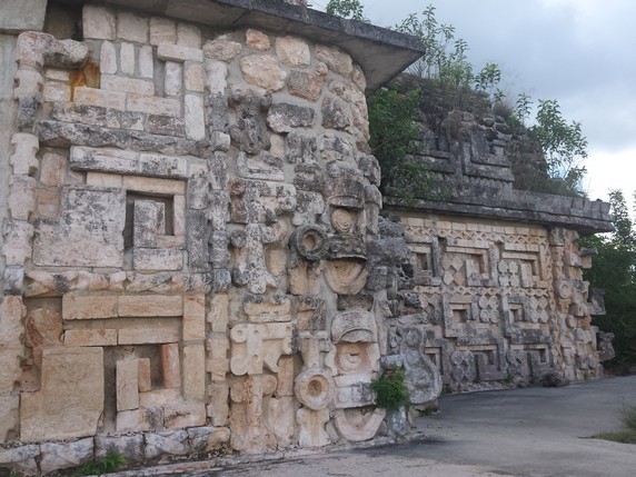 Seguimos la ruta dirección Santa Elena sin detenernos en Labna, Xlapak y Sayil. Vamos directos a Kabah (acceso 47 MXN). La antigua ciudad maya está dividida en dos por la carretera, a un lado un arco marca la entrada del sacbé (camino peatonal) de 18 kilómetros de largo y 5 metros de ancho, que lo unía con Uxmal; y junto a él una pirámide derruida. En el lado de las taquillas de acceso se encuentran los elementos principales. El más llamativo es un palacio decorado completamente por mascarones tallados en piedra del dios de la lluvia Chaac. Tras él hay un enorme palacio, lleno de columnas, construido a dos niveles.