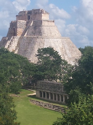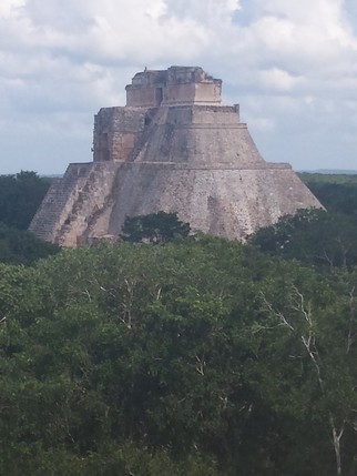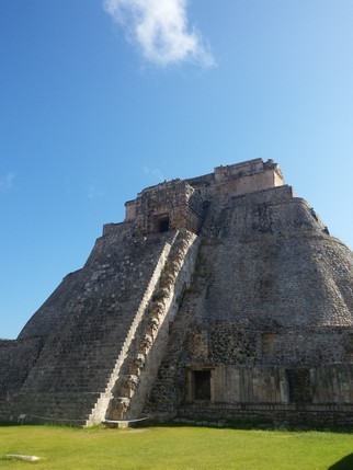 Uxmal. Acceso 206 MXN, parquing 30 MXN, espectáculo nocturno 86 MXN. Yacimiento más compacto, más fácil de recorrer, mejor señalizado, y mucho menos turístico, que Chichen Itza. En cuanto a espectacularidad, la misma o más. Lo primero que vemos al entrar es la Pirámide del Adivino, una impresionante estructura ovalada de 35 metros de altura. Tras ella están el Cuadrángulo de las Monjas, un gran patio delimitado por cuatro edificios con habitaciones; la Gran Pirámide, puede
