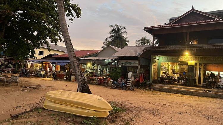 Kampot Transports, compramos un billete de bus a Shianukville (3h) combinado con ferry a Koh Rong Sanloem (1h), con billete abierto a la vuelta, por 32$ cada uno. La única opción que encontramos para comer en el puerto de Shianukville fue